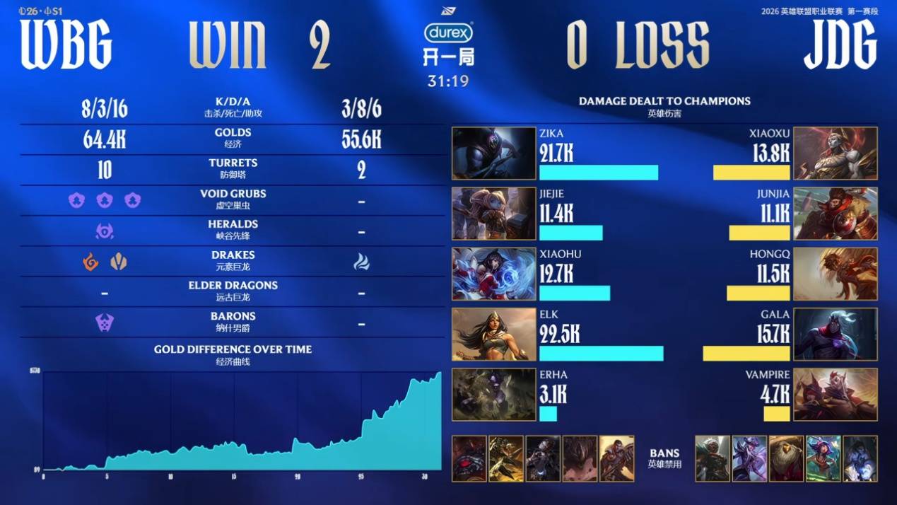在打JDG的比赛开始之前,JDG是以出色的表现横扫击败了四连胜的BLG,终结对手连胜后,JDG将有机会完成首轮登顶的目标,只要本轮能够击败WBG就可以,结果让观众们没想到的是JDG刚赢BLG就翻车了,还是输给了之前状态一直不是很好的WBG。