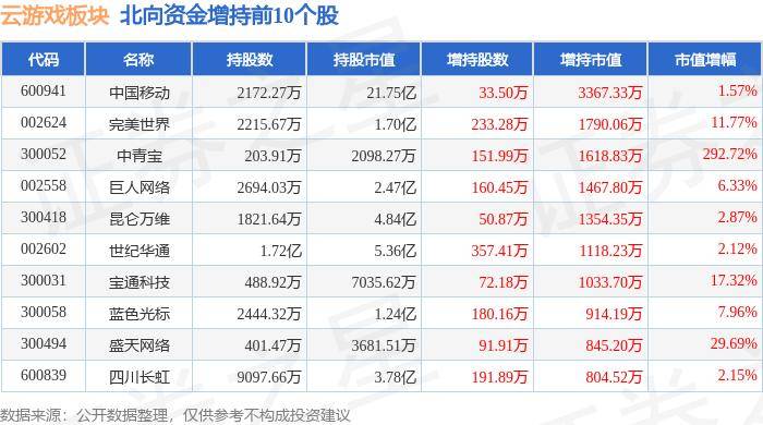 北向资金方面,当日云游戏板块北向资金持股市值为76.19亿元,增持1.47亿元。其中增持最多的是中国移动,增持了0.34亿元。减持持最多的是三七互娱,减持了0.18亿元。云游戏板块北向资金持股变动明细见下表: