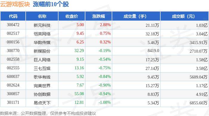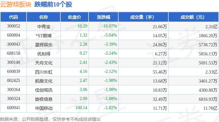 证券之星消息,8月12日云游戏板块较上一交易日下跌1.43%,中青宝领跌。当日上证指数报收于2858.2,下跌0.14%。深证成指报收于8373.47,下跌0.24%。云游戏板块个股涨跌见下表: