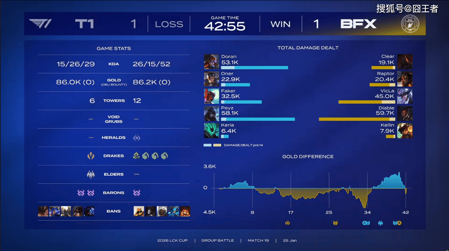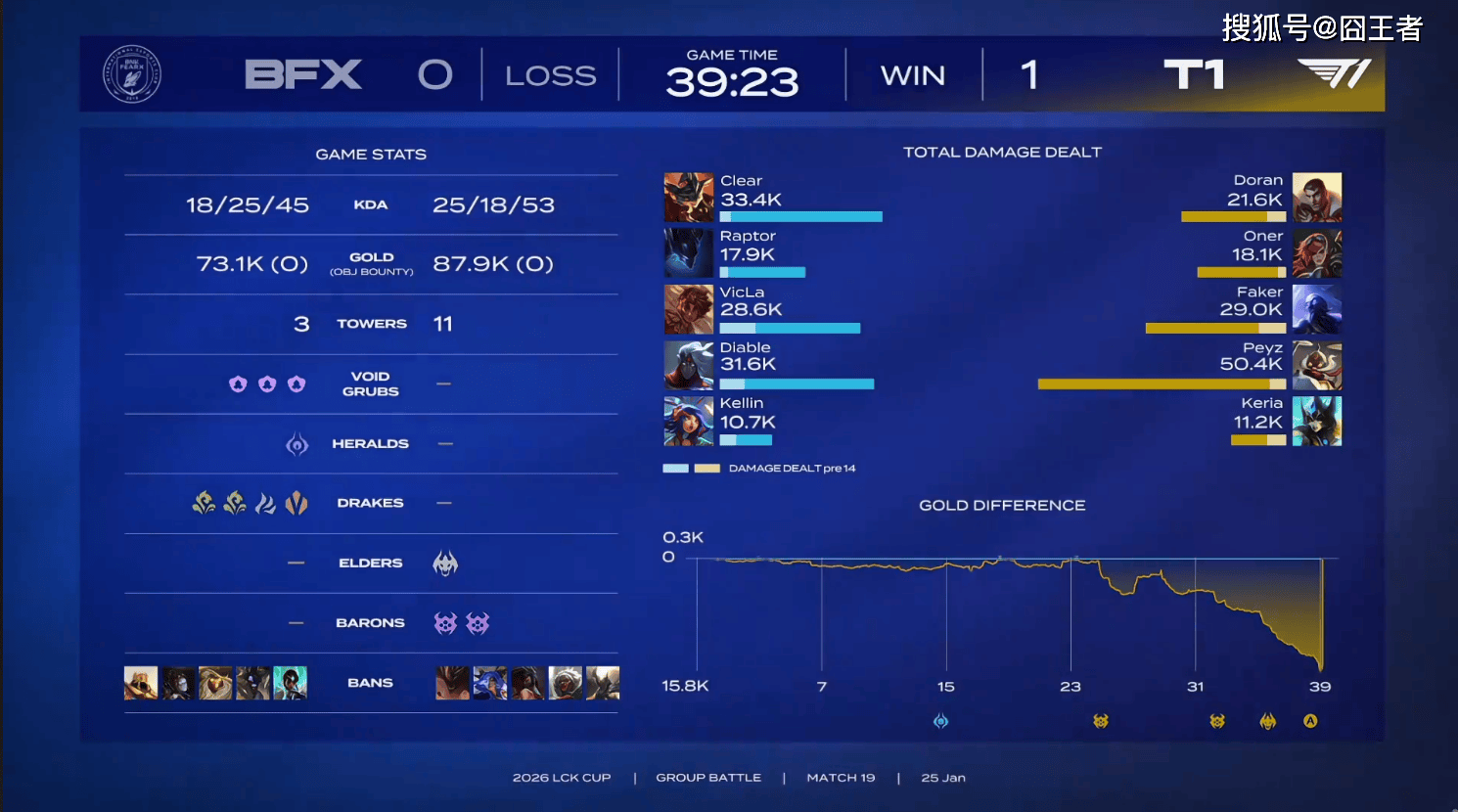 结果第一局比赛,前20分钟,两队打得比较胶着,经济一直无法拉开。比赛第25分钟左右,Peyz飞机三杀帮助T1打出0换3后拿下大龙;比赛第27分钟左右,BFX中路反击打出1换4打断T1大龙推进;比赛第29分钟左右,BFX打出2换1拿到炼金龙魂;比赛第32分钟左右,Peyz飞机团前打残Diable韦鲁斯,T1打出1换3后拿下大龙;最终比赛第39分29秒,T1打出0换3拿下远古龙,随后一波结束比赛。