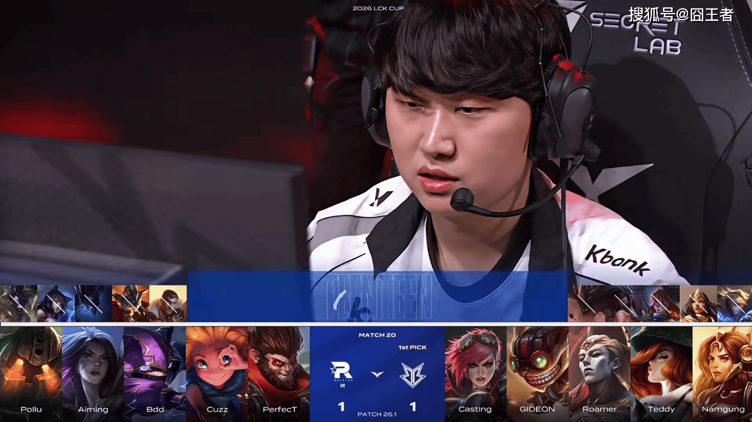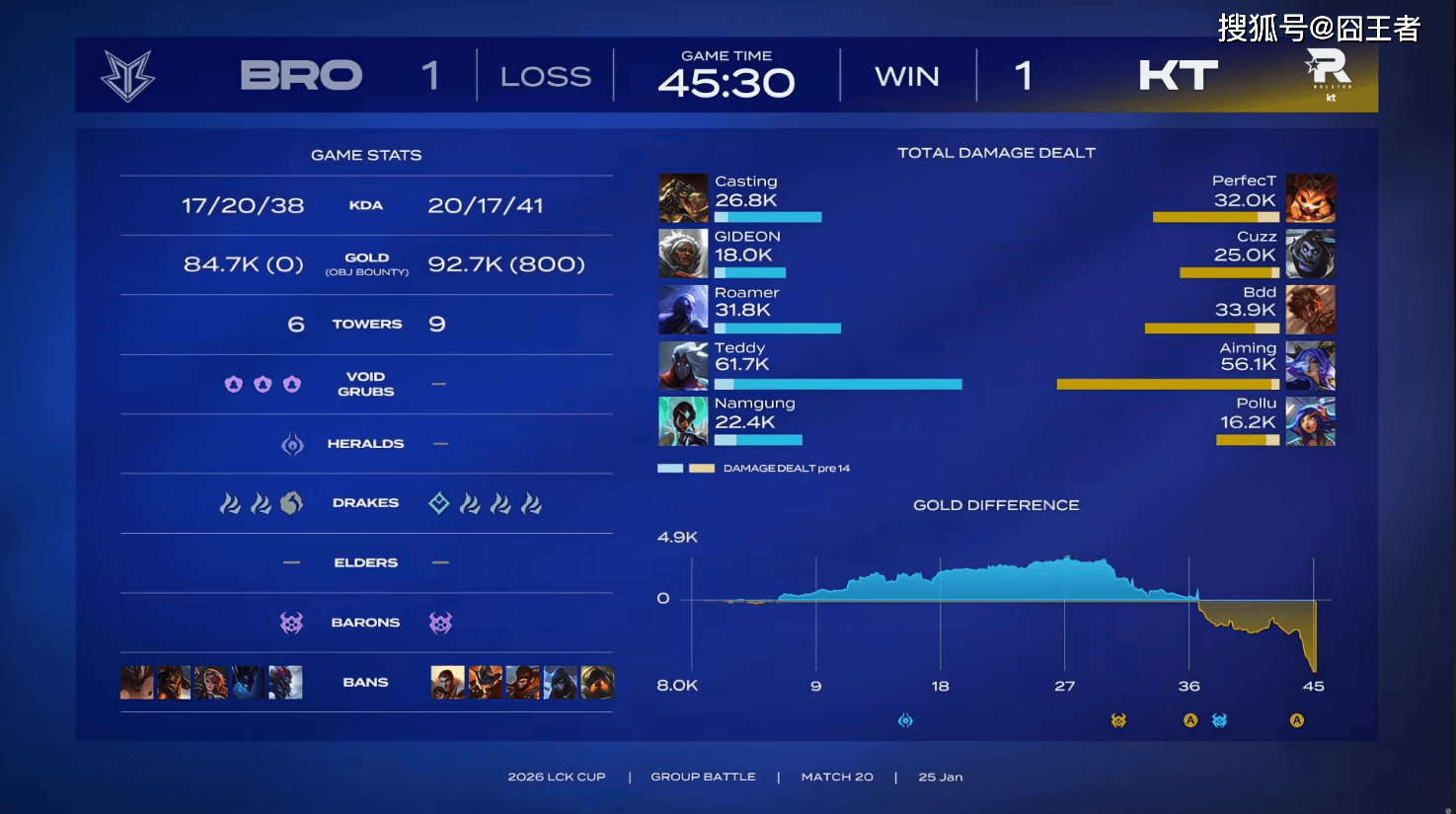 第一局比赛,BRO蓝色方,禁用:兰博、杰斯、狼母、牛头、芸阿娜,选用:Casting格温、GIDEON潘森、Roamer发条、Teddy、Namgung;KT红色方,禁用:石头人、妮蔻、鳄鱼、韦鲁斯,选用:PerfecT奎桑提、Cuzz、Bdd沙皇、Aiming、Ghost