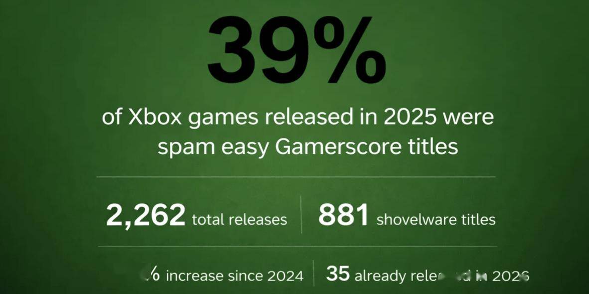 数据显示,2025 年 Xbox 平台共发布了 2200 余款游戏,其中约 880 款(约 39%)质量极差,仅是为了“刷成就”存在。相比之下,2024 年此类游戏仅有 290 款,一年内暴增了 204%。