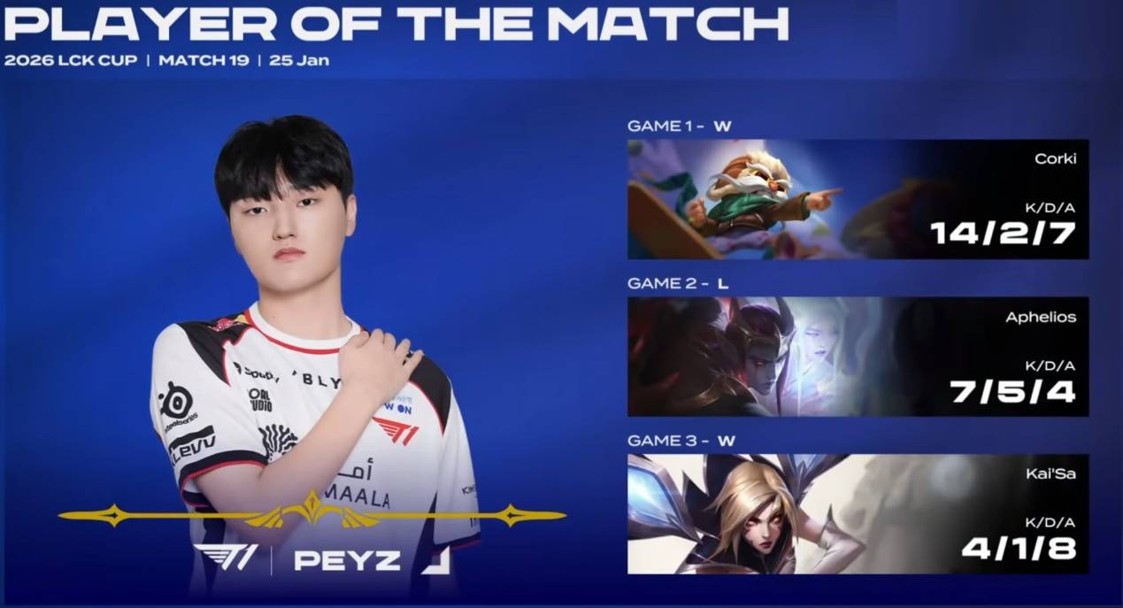 决胜局中Oner的潘森也是化身战神,输出爆炸让BFX无法处理,甚至出现了Oner一个追着三个打的局面,Peyz卡莎也是状态拉满,在队友发挥都很出色的情况下,拿下了本场比赛的POM,这对于T1来说是最好的消息。