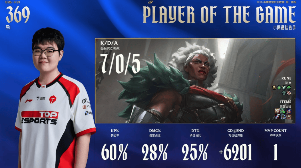 此外,赢下这个BO3的最大功臣莫过于359,肉眼看得出来他的状态在逐步回暖,操作和意识都在线,第一局游龙狼母直接把IG打崩了,拿下MVP实至名归。但话又说回来,IG目前上单Soboro跟登峰组的其它上单对比起来还是差了点,与369对线就能看出实力差距。此时此刻,又有多少人在怀念IG上一任的上单呢。