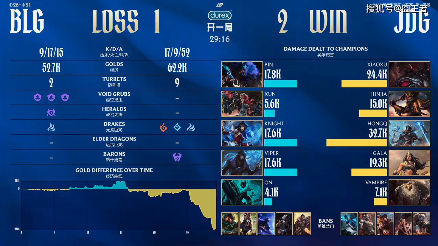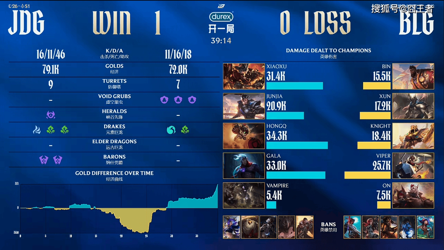 结果第一局比赛,两队各打了半场好局,JDG笑到了最后。比赛前期,BLG一度打出7000经济领先;比赛第25分钟左右,ON洛先手开团被秒,JDG反击打出0换5后拿下大龙;比赛第28分钟左右,JDG打出0换3后逆转经济劣势;比赛第37分钟左右,JDG开团打残BLG众人后拿下大龙;最终39分14秒,JDG团灭BLG,一波结束比赛。