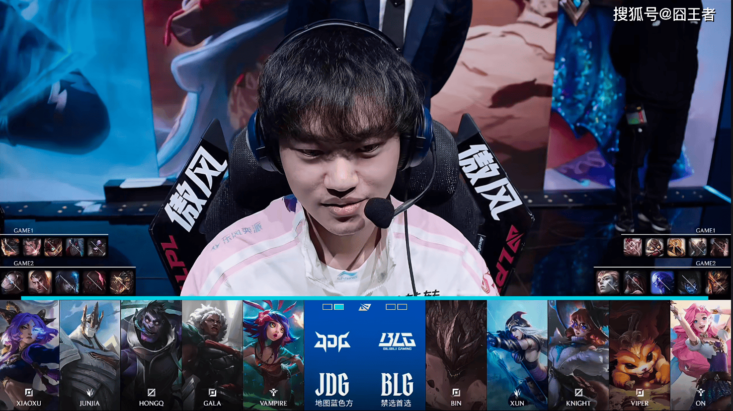 第二局比赛,J DG蓝色方,禁用:发条、杰斯、厄斐琉斯、塞恩、鳄鱼,选用:Xiaoxu安蓓萨、Junjia蒙多、HongQ加里奥、GALA芸阿娜、Vampire妮蔻;B LG红色方,禁用:亚恒、阿卡丽、瑞兹、塞拉斯、皇子,选用:Bin纳尔、Xun石头人、Knight阿萝拉、Viper艾希、ON萨勒芬妮