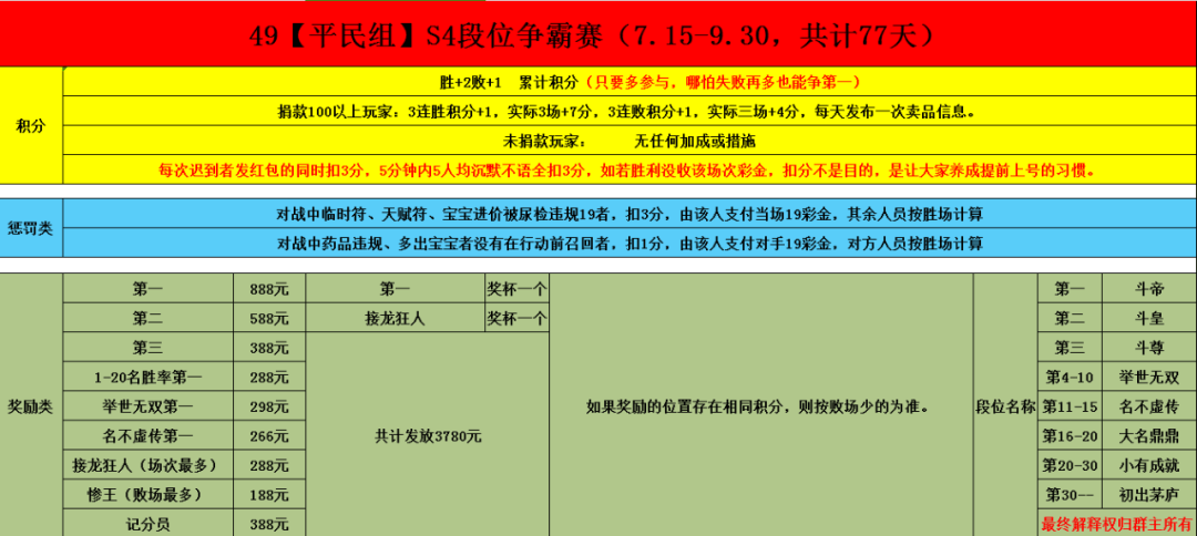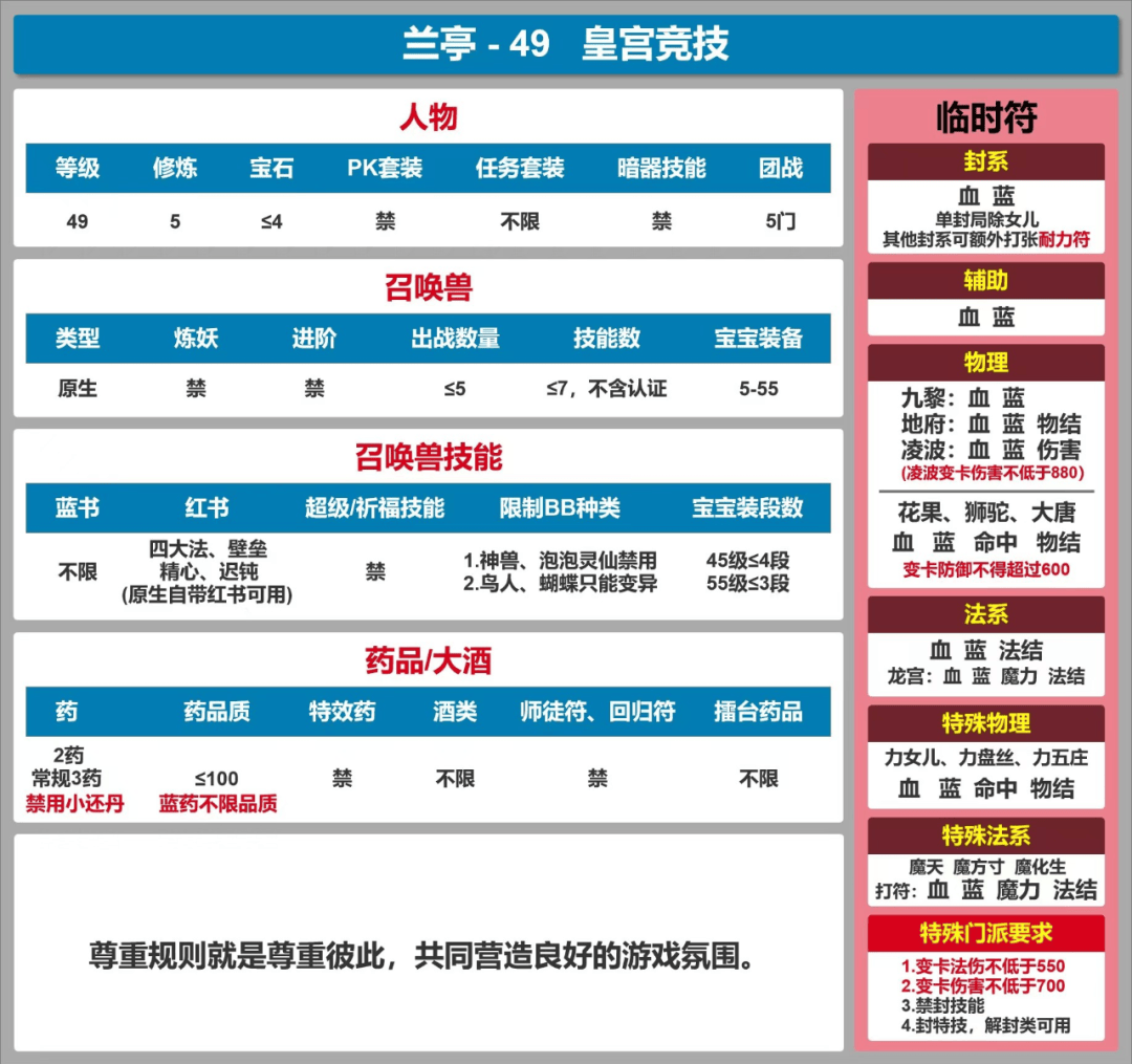 规则方面,他们制定了比群雄萌新杯更公平公正的专属规则。不仅宝石段数限制在了4级,召唤兽禁止炼妖、进阶,甚至还细节到限制临时符来保证不同门派之间的强度平衡这规则设定,就问你们对平民来说够不够公平、合理?