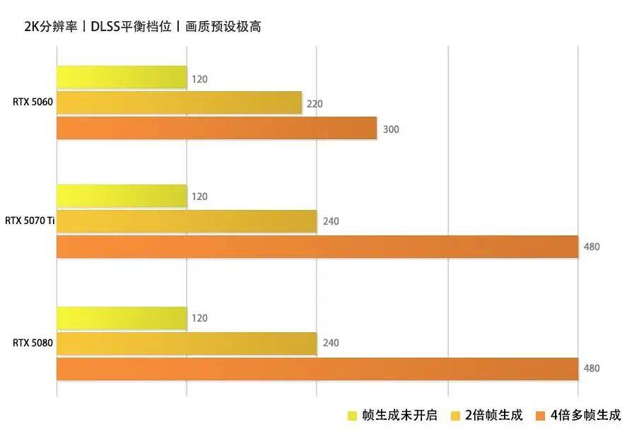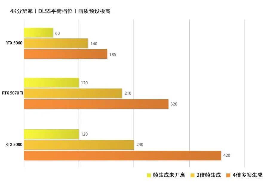 到了4K画质下,RTX 5060仍能以185FPS流畅游戏;RTX 5070Ti在2倍帧生成模式和4倍多帧生成模式下,分别能达到210FPS和320FPS左右;只有RTX 5080依旧冲击着480FPS的帧率上限、维持在420左右,战斗中会向下波动到约380FPS,仍然稳定在电竞级别的高帧率表现。