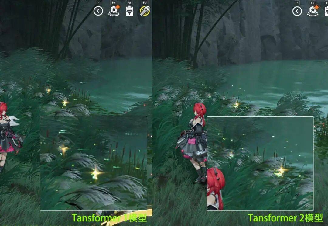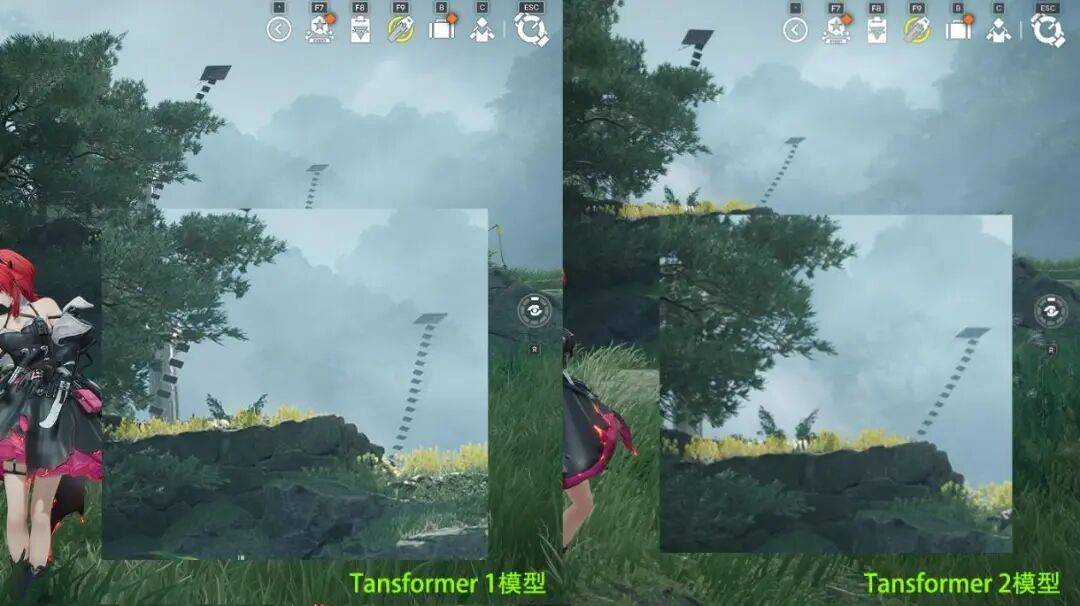第2代transformer 模型对模型边缘的细节也有一定提升,在把截图放大数倍后,能看到物体边缘会变得更清晰可见。这种改变更潜移默化,一眼看过去能感受到画质的提升,但如果让你说,又一时找不出具体改变,全都藏在了细节里。