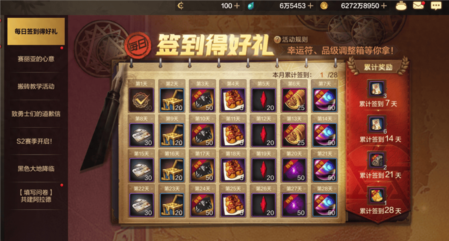 这不刚刚结束了七月份,dnf手游八月的两大福利活动就进行了更新,最高奖励20张幸运符。可能大家也是发现了,这个每日的签到活动也是进行了更新,奖励虽然变化不大,但也有200张深渊票和200个炉岩碳了,而且签到28天还有1张幸运符呢。重点是这个第六天和第13天送的奖励啊,这总共竟然送了50个小丑印章,而这也是辅助职业的最强福利啊。