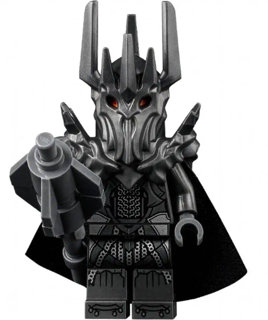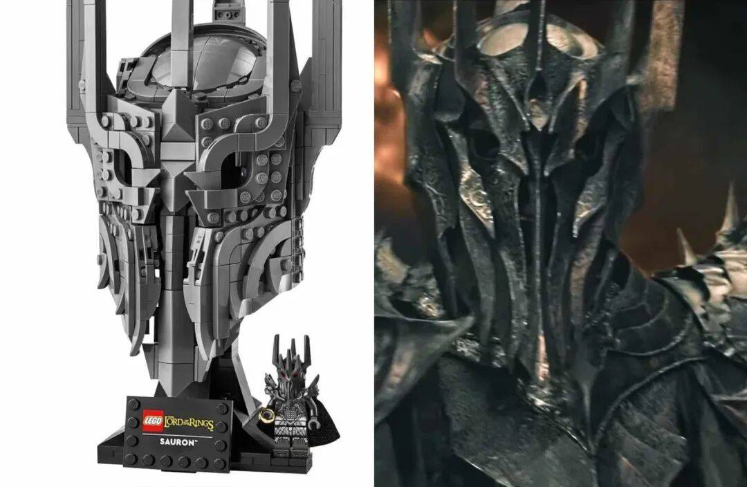 将乐高模型与《指环王》电影三部曲中的索伦形象进行对比,可以看出整体设计重点放在角色轮廓与关键特征的呈现上。