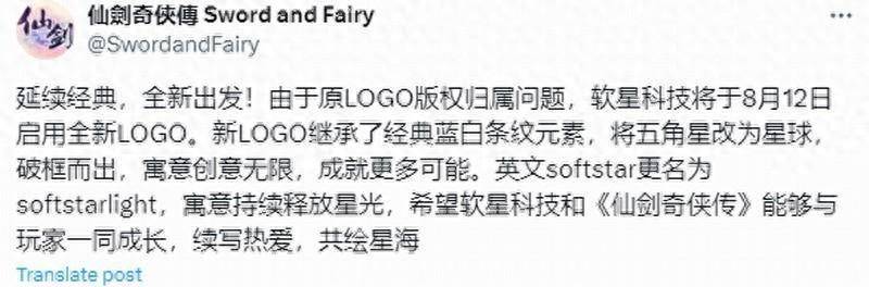 近日《仙剑奇侠传》官方在推特上发文称,由于原LOGO版权归属问题,软星科技于8月12日启用全新LOGO与英文名“softstarlight”。