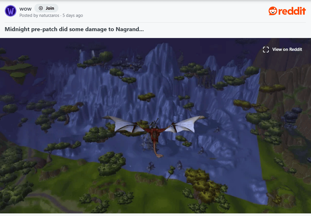《魔兽世界》至暗之夜前夕已上线近一周,不出所料,新版本充斥各种各样的Bug。例如攻略站icy-veins就发现,原本风景如画的纳格兰山脉不知为何变成了3D打印风的灰幕,以及翱翔的巨龙突然开始成群结队地出现在东部王国的北边天空。
