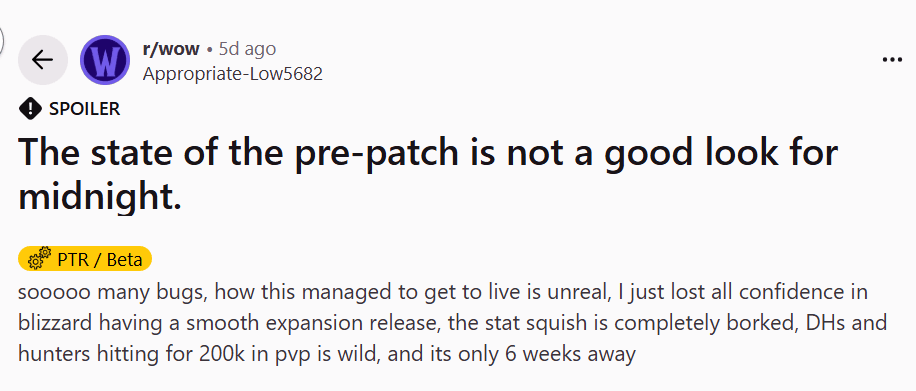 除此之外,新版本还出现任务无法完成、用户界面失效、幻化自定义功能不能使用等问题。在Reddit论坛魔兽区,充斥着各种吐槽贴,大家似乎对此已经习以为常。