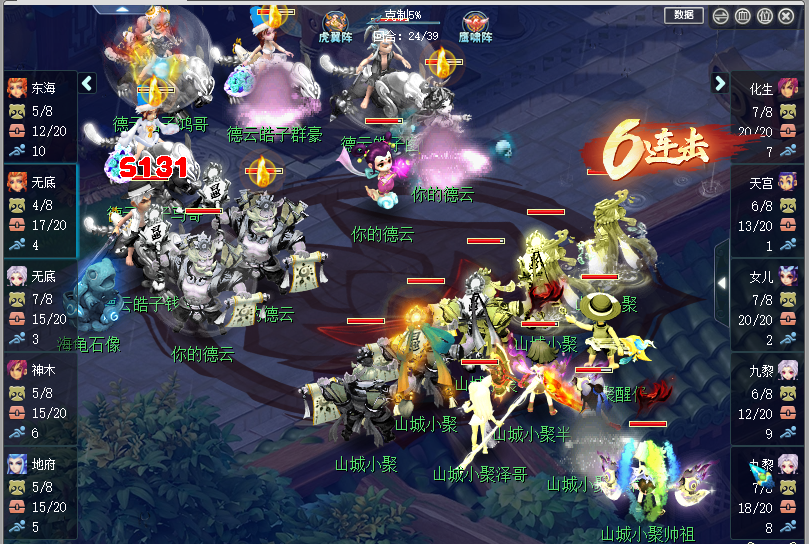 22、24回合,【山城小聚】九黎城使用双噬魔神壶接连击倒【德云皓子】双无底洞,噬魔神壶为灵宝技能固定伤害,双九黎城同时使用可以无视封印出手,稳定点杀一个单位,紧接着【山城小聚】接连封印【德云皓子】辅助神木的法术,阻止【德云皓子】回伤站起,全身是伤的【德云皓子】双无底洞即使被拉起也很容易接踵而来的九黎城面伤再次击杀倒地。