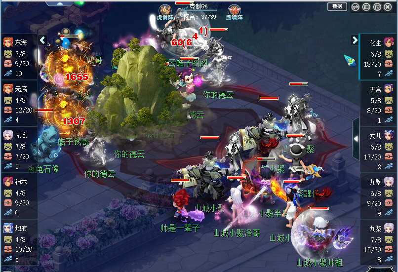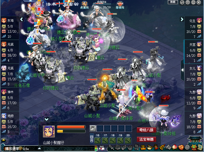 32回合,【山城小聚】双灵宝出手击倒了【德云皓子】辅助神木,36回合【德云皓子】试图点杀【山城小聚】九黎换取回复时间,却因为【山城小聚】前期的天雷斩降灵力输出不足,导致点杀失败,无法打断【山城小聚】的面伤输出。
