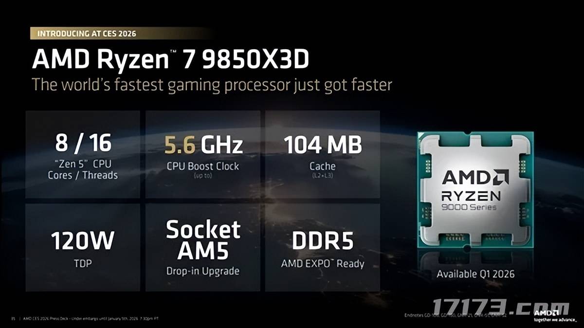 AMD锐龙7 9850X3D 1月29日上市!游戏CPU性能提升7%,主频5.6GHz,对比Intel旗舰领先27%。