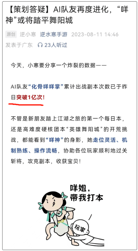 据说,在《逆水寒》手游上线仅40多天的时间,咩姐就陪玩了一亿次,甚至AI陪玩都有点卡顿,后来网易紧急扩容服务器,才让玩家畅快和咩姐一起打本。