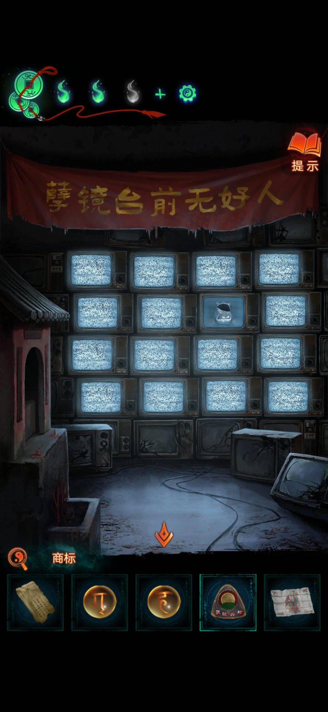 返回孽镜台,对电视使用商标(第一排第三个贴商标)(这个商标道具上有红色小箭头,看道具介绍里也有说明,>3说明从左往右数第三列,∧4说明从下往上数第四行) 然后根据沙漠滚桶上面线索调整获得珠子,解开了记得读里面书上的线索