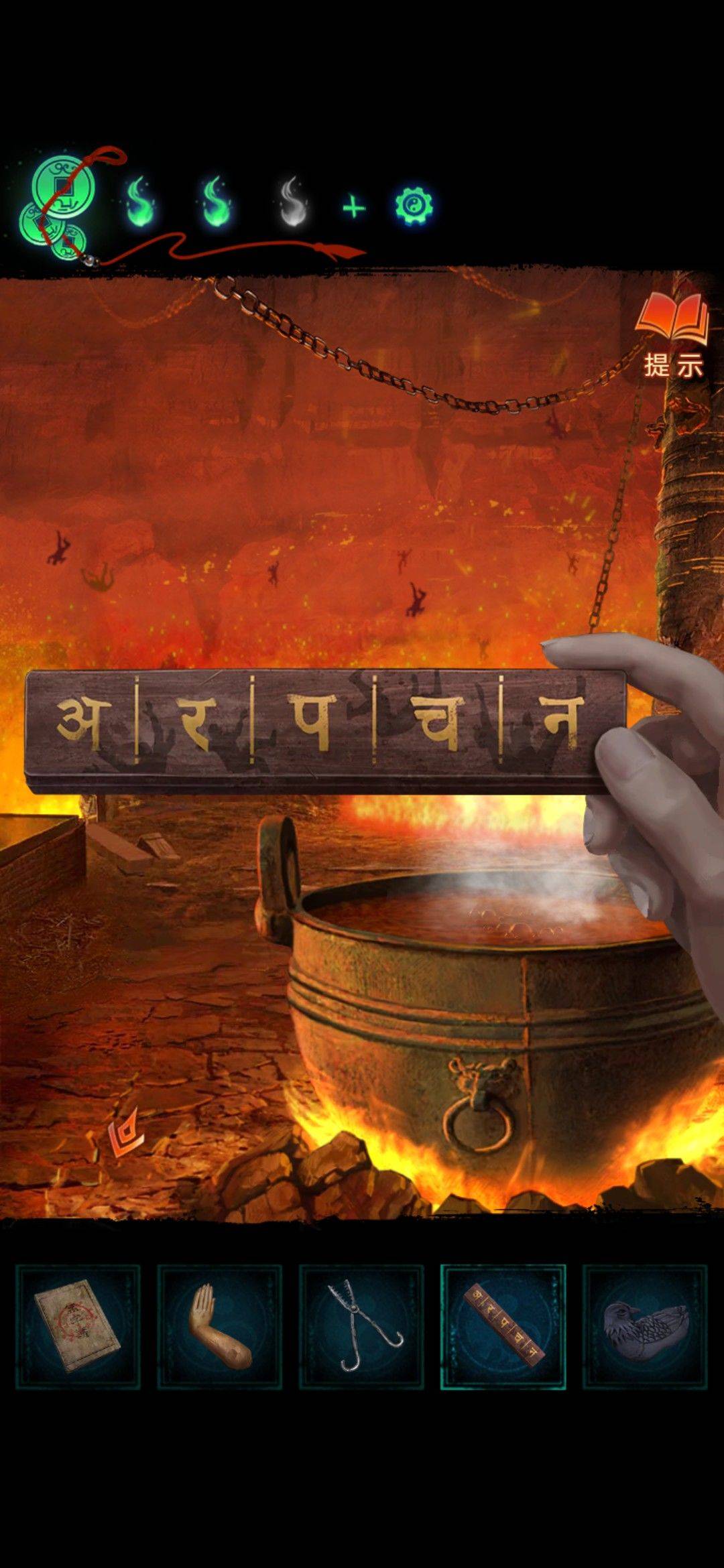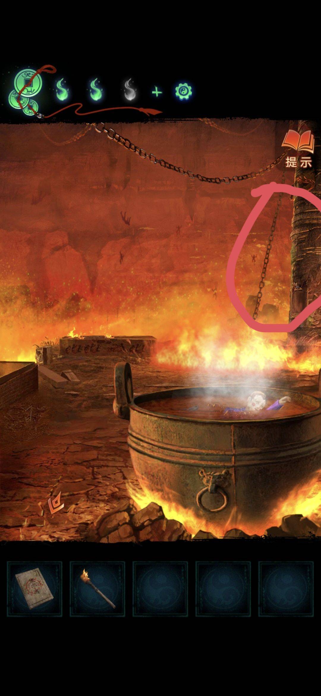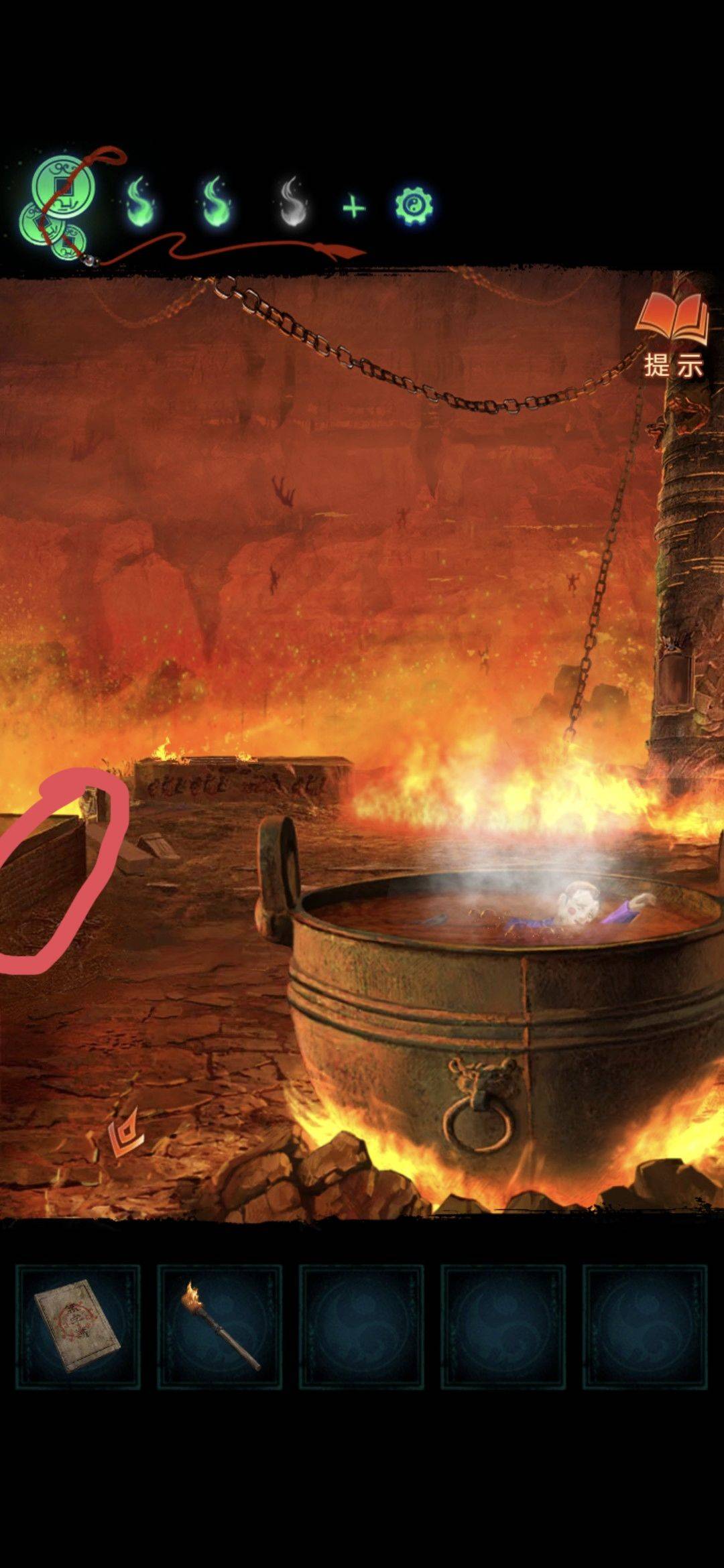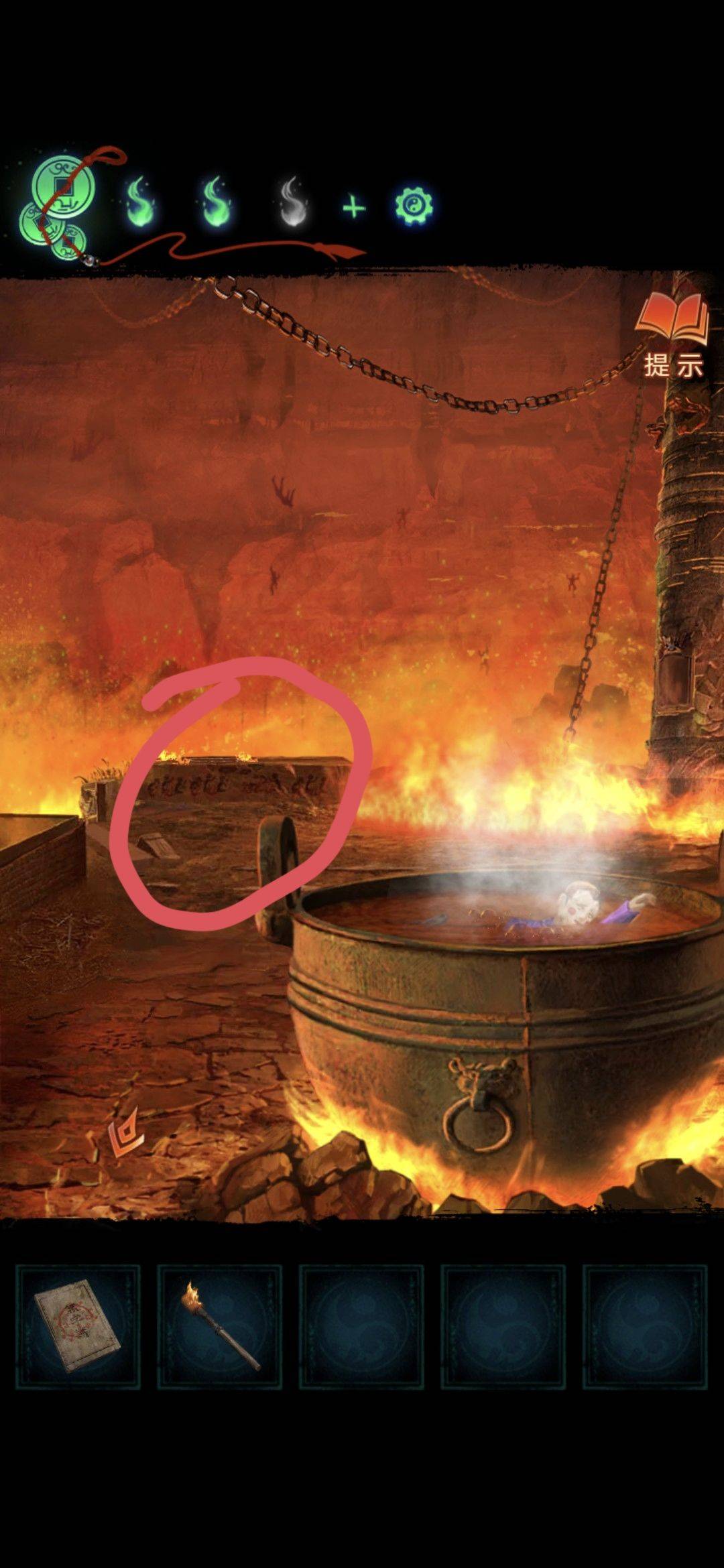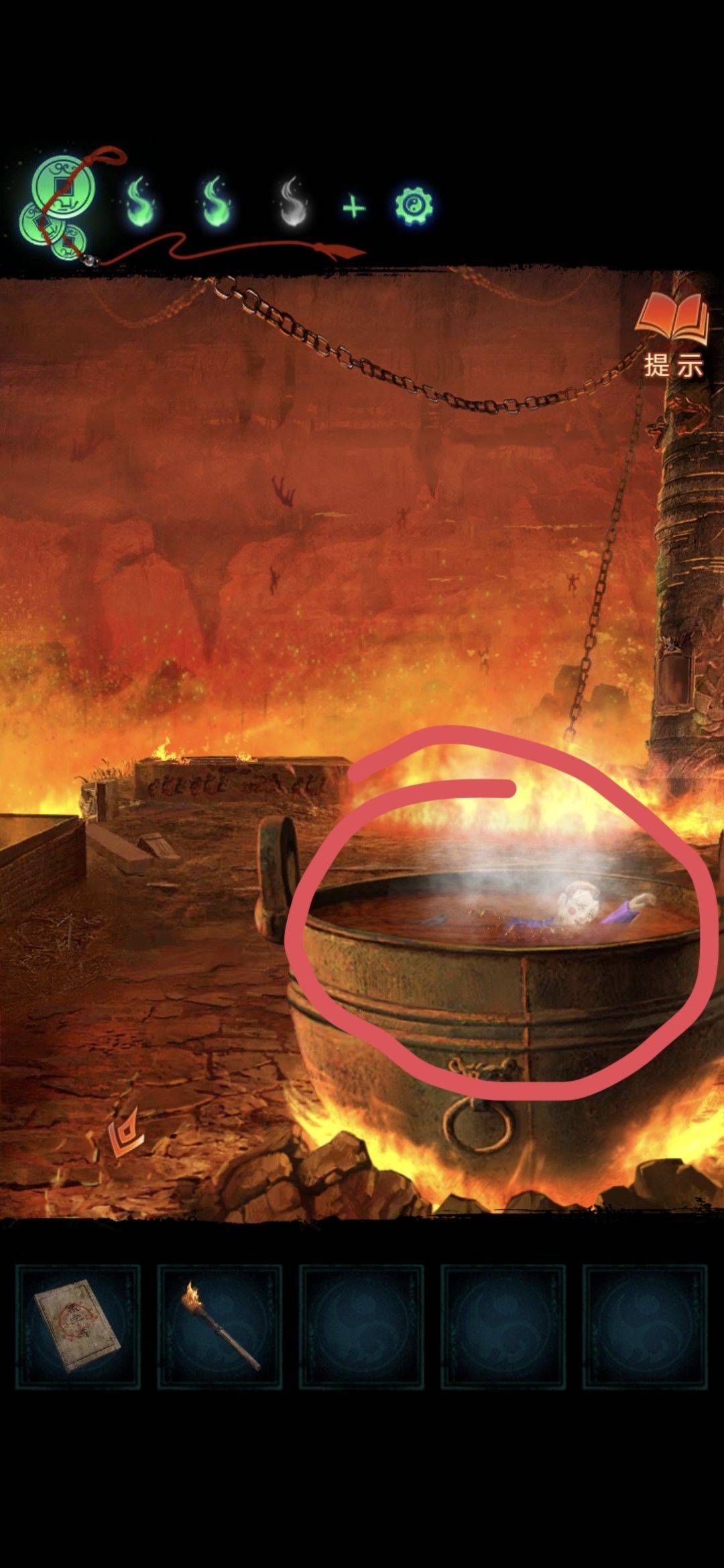 回到大铁锅的场景,用大夹子夹取锅里,获得道具浮雕块