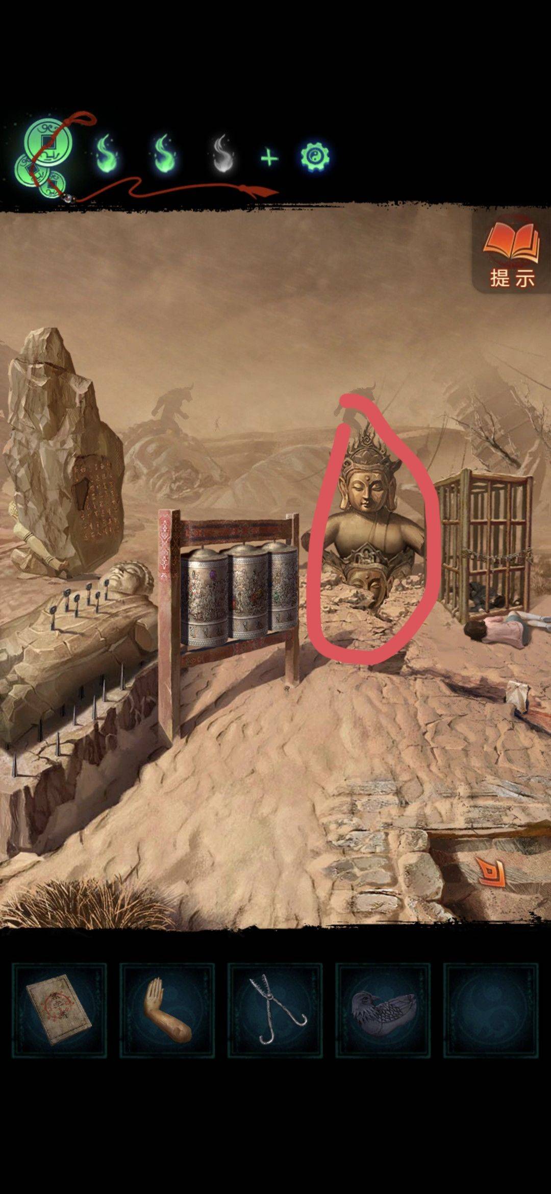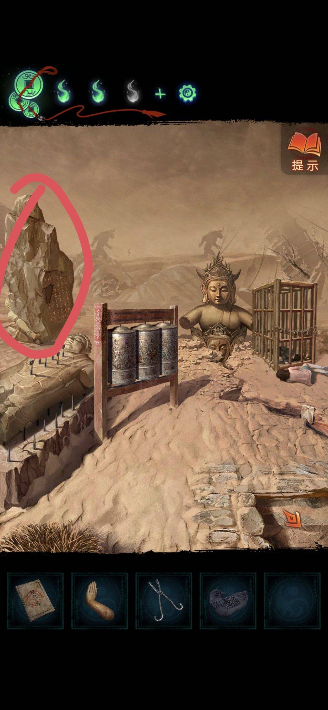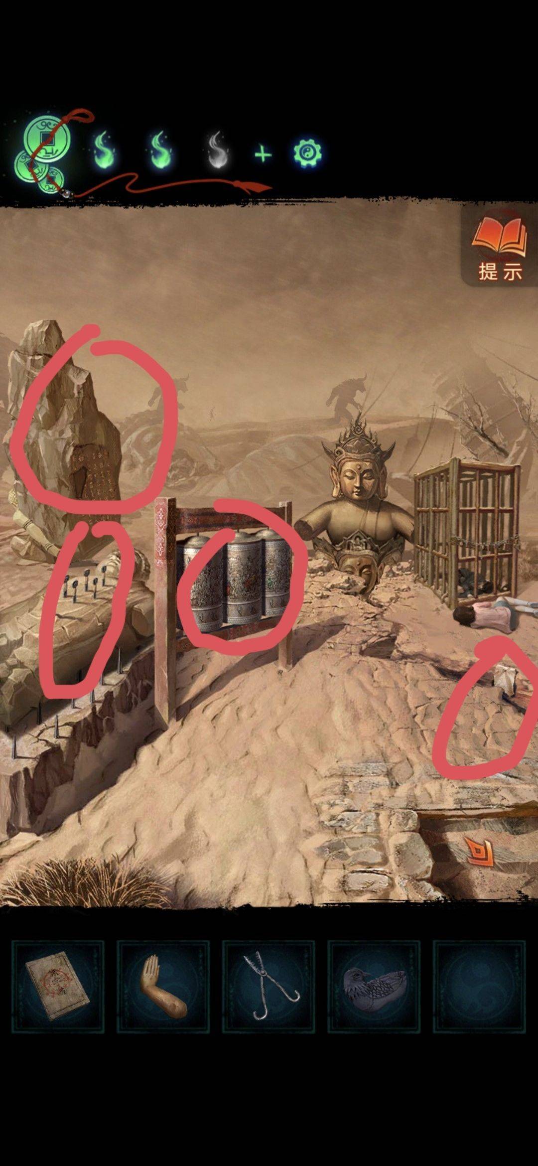 回到雪地,地面上拿到碎冰块,桌子上拿到童子钥匙,然后回到转轮殿捡上男童子像(回魂崖旁)返回沙漠里石头洞口进去对话推理线索