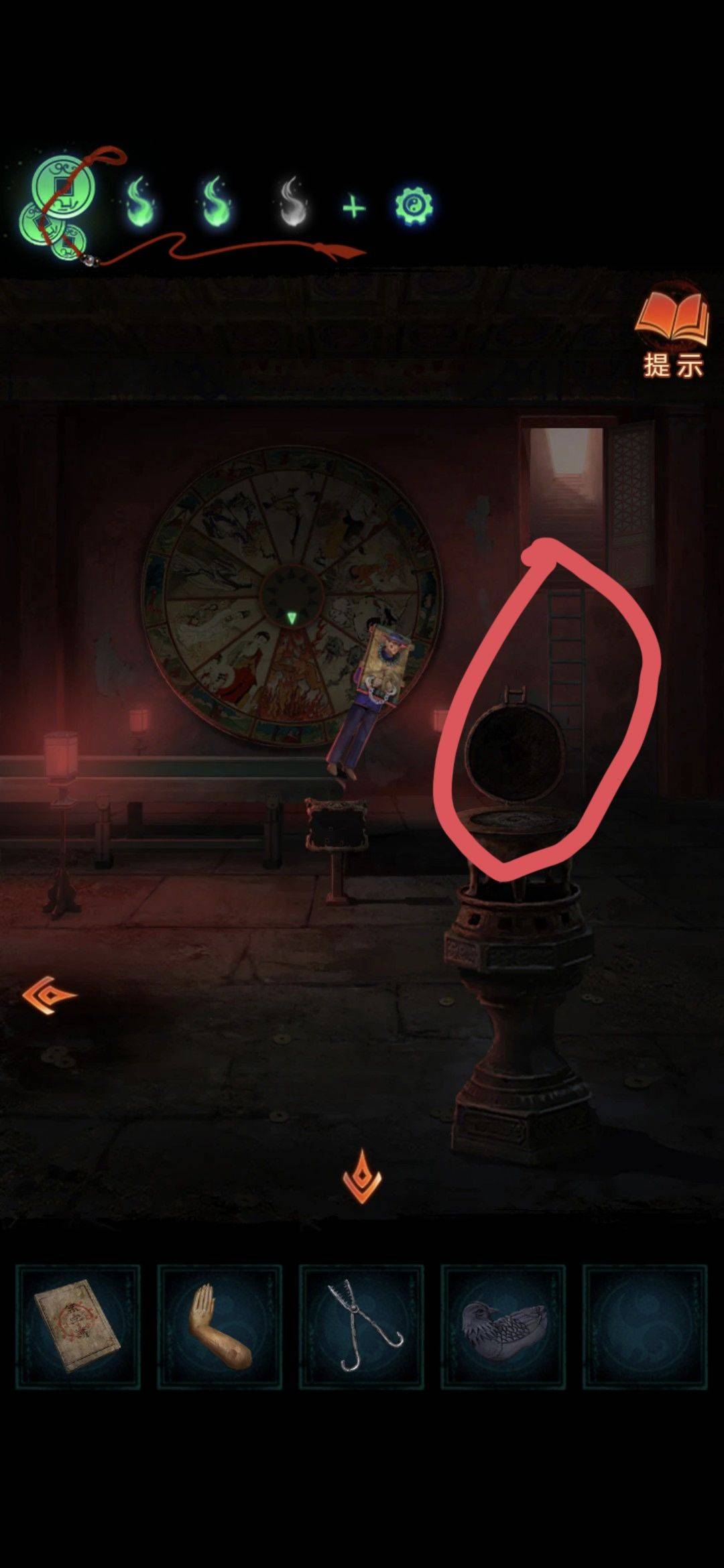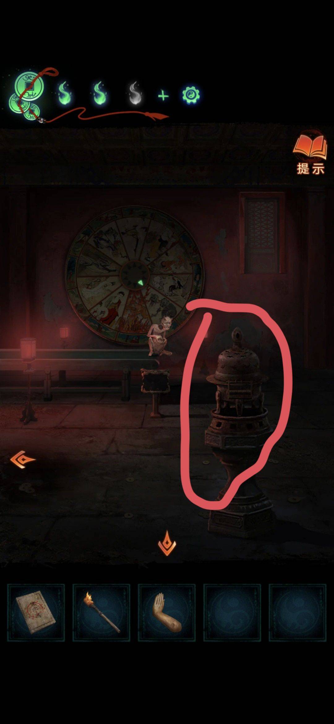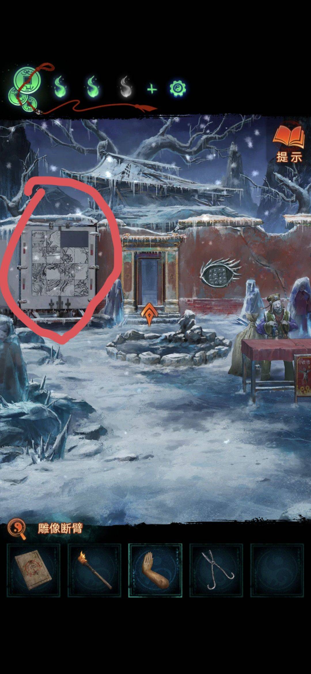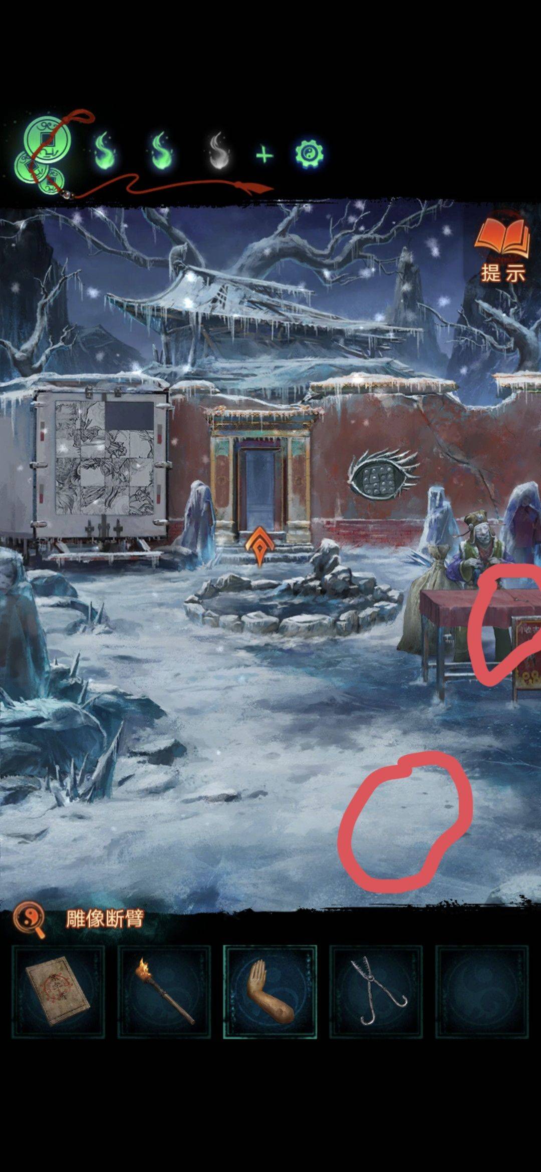 切换场景拾取地上道具雕像断臂,切换雪天场景纸人拾取道具大夹子,水池用火把烧破冰层(注意有高能,害怕的请准备好),用大夹子夹取道具戒尺