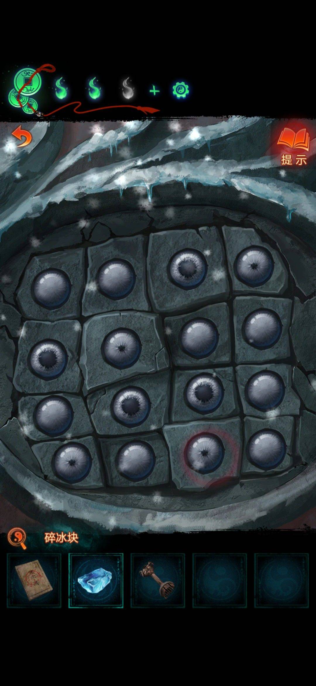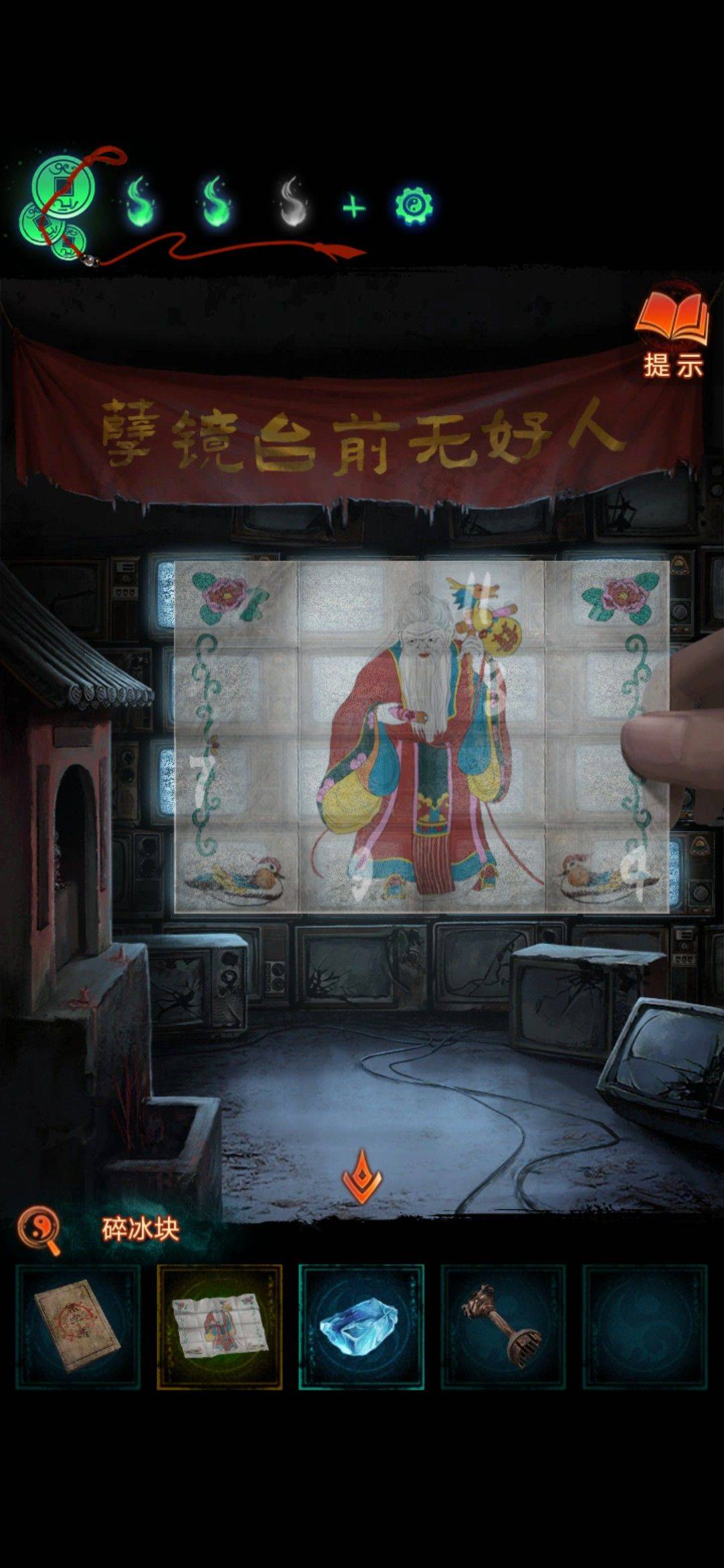 然后用月老图看可以获得线索,根据月老图线索如图调整频道,然后出现线索,根本眼睛位置调整雪地墙上的机关,然后获得童子钥匙和磨具