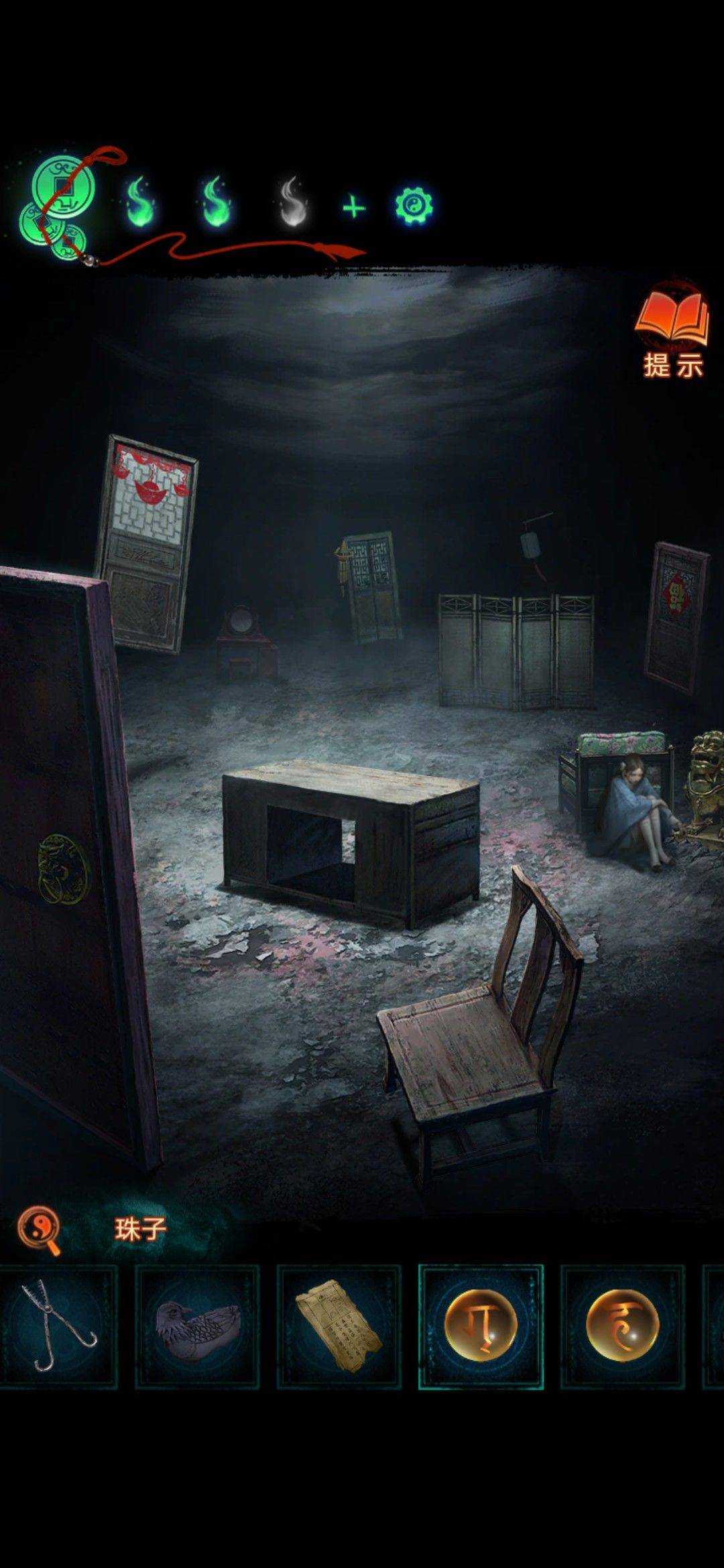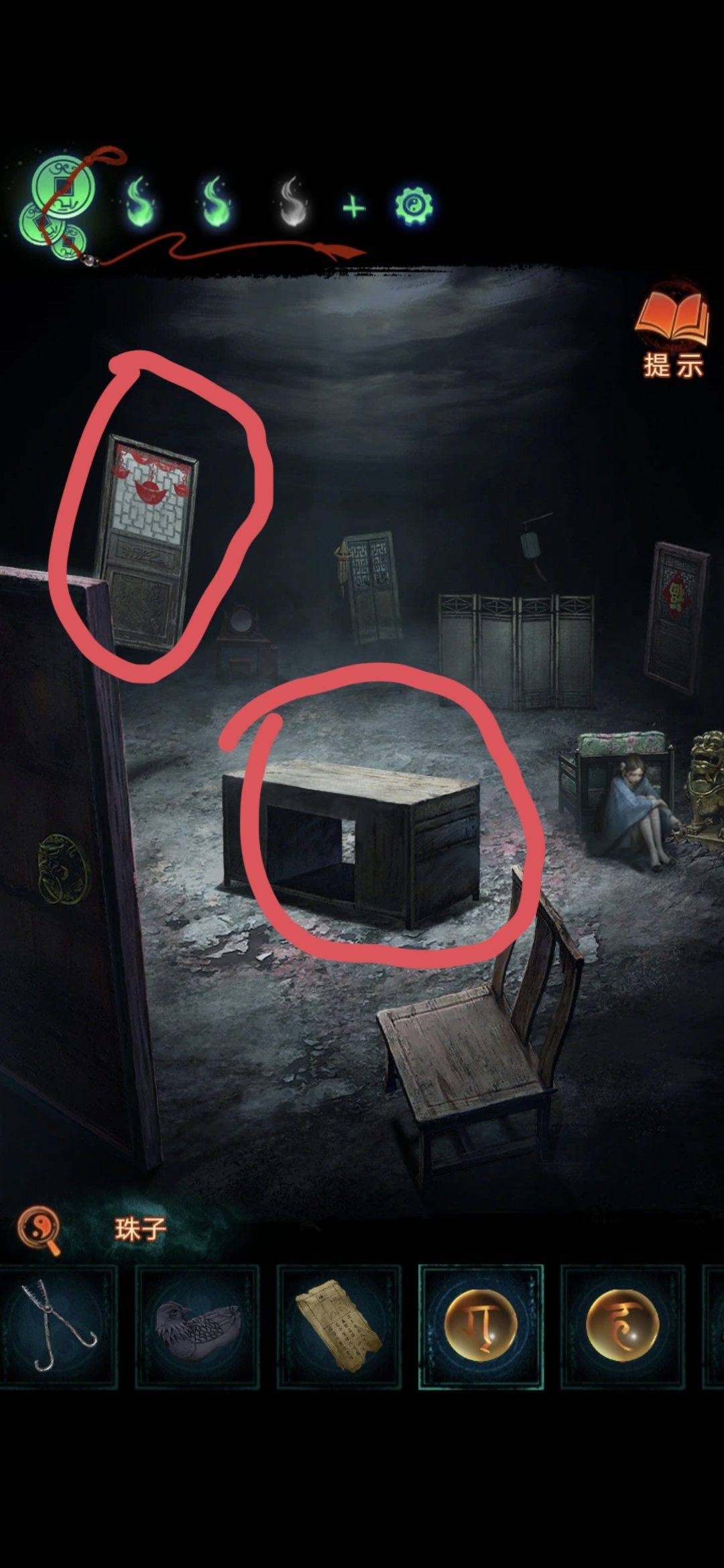 把雕像手臂和雕像断臂安装上出现孽镜台洞口,进入然后点击亮着的电视,调整上面书包的图案位置(线索就是地缝里拿的书页上)获得珠子和布娃娃