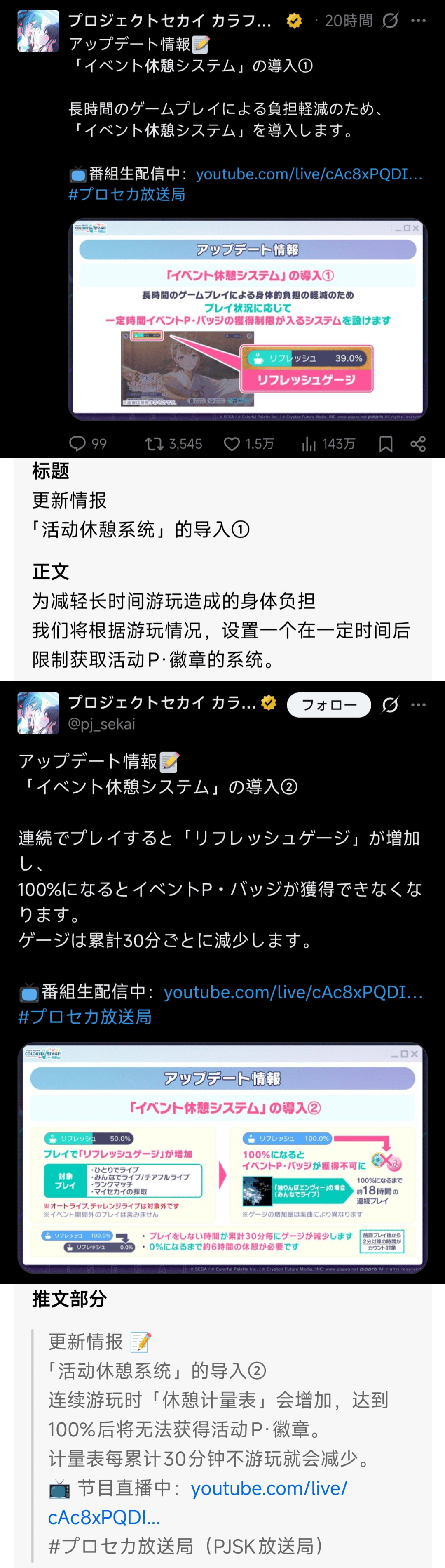 也的确有玩家从身体健康和法律风险方面进行考虑,赞成这种系统。毕竟人的身体不是铁打的,就算是平常对pjsk基本无关心的姬,也曾经看过好几个因为冲榜而撕得昏天黑地的瓜——姬不懂pjsk排位玩家的弯弯绕绕,但姬知道要打排位会非常麻烦,所以撕得也格外惊天动地。