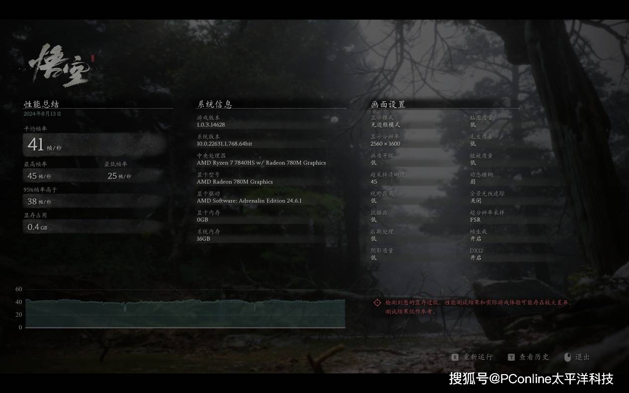我们还尝试了一台搭载AMD R7-7840HS处理器和Radeon 780M核显的笔记本电脑。在2K分辨率、全低画质设置下,开启FSR和帧生成技术后,游戏仍然保持了40+帧的平均帧率。这一结果充分证明了游戏优秀的优化水平,甚至让集成显卡用户也能相对流畅地体验游戏内容。