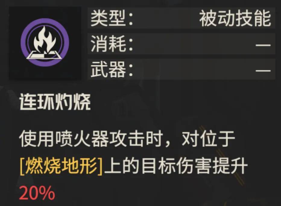 这里针对在“燃烧地形”上的敌人会增伤20%,然后绘梨沙在行动后的格子都会被施加“火焰地形”,因此其积累“升温”buff的效率还是不错的,一般来讲第2回合都可以积累出第一次的15层“升温”,从而回复2点AP,最后则是自身处于“火焰地形”上时子弹+1,那喷火器的本来子弹数位8颗,这相当于就是12.5%的提升,此外火焰伤害系数还有10%的提升,这里我们就直接上伤害实测对比吧。
