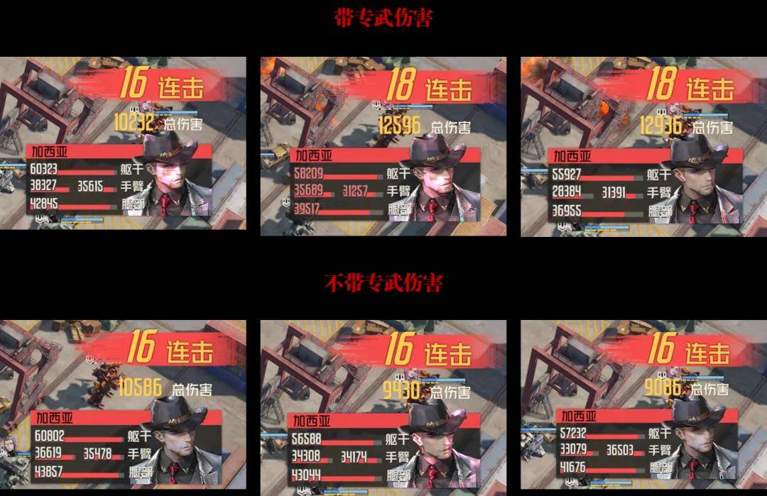 如上图所示,三幅横向图片的第一张都是第一次使用【聚焦灼烧】时的伤害(当然图片上只是维一贴出来的一组,实际上还做了多组的对照测试),然后中间和右边的这两幅则是罗娜再动绘梨沙后的两次普攻输出,在没有考虑子弹缺失的前提下,带专武的三次攻击总伤害约为36000左右,而不带专武的三次攻击总伤害则约为29000左右,提升幅度约为24%,此数据大家参考一下即可。