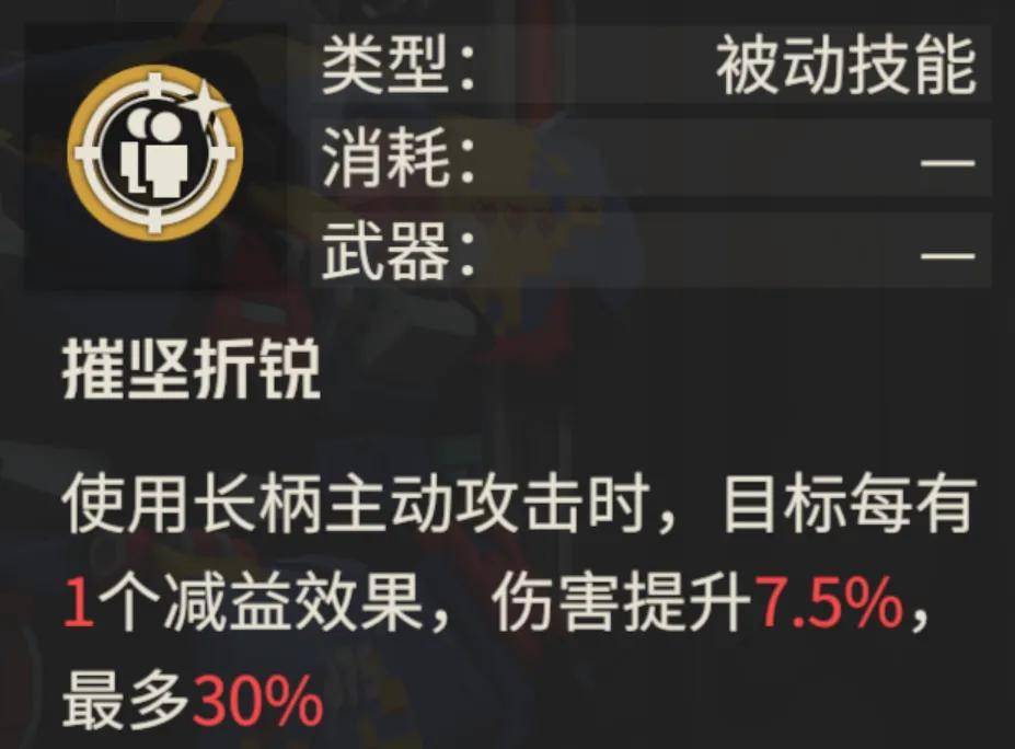 那么这个专武一是可以定向提升白月的输出伤害,1-4个debuff按数量增伤,常规状态下白月自身的光环算一个,然后赫拉克勒斯的模组算一个,然后【碎月】点头击杀敌人后的定身状态算一个,最后如果白月能带上【钢锋】这个技能,则自身都可以形成给对方4个debuff的全增伤条件。