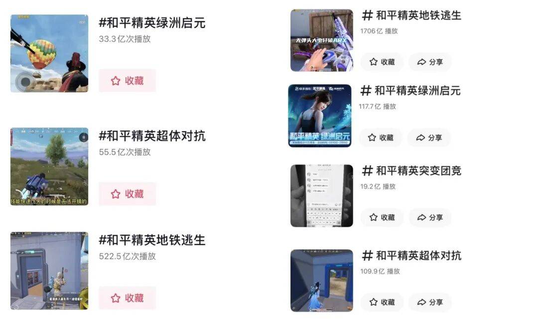 像是在抖音,《和平精英》超体对抗、绿洲和地铁逃生等模式的单个话题标签视频都已经累积到几十、几百亿的播放量,其内容生态完全不亚于一款成功的热门产品。