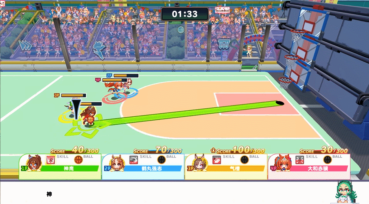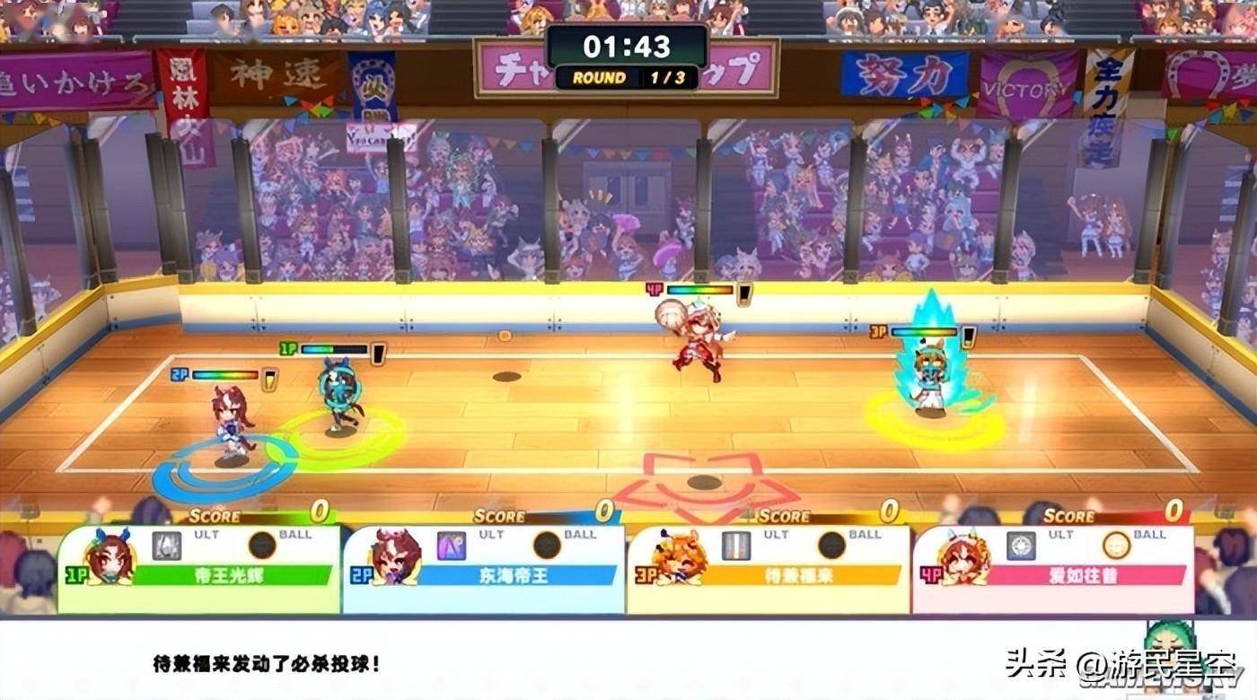 除此之外,比赛过程中还会出现分数数倍于普通球的特殊球。它的存在让垫底的人一球翻盘成为了可能,也极大地增加了场上的变数和激烈程度。马娘们的技能也是各有特色,有的可以生成让人无法近身的结界、有的可以直接冲刺大半个场地,还有的可以召唤飞碟将正在潇洒过人的对手吸到空中。这些或强化自身或干扰对手的能力,也让这场篮球乱斗的场面更加有趣和混乱。