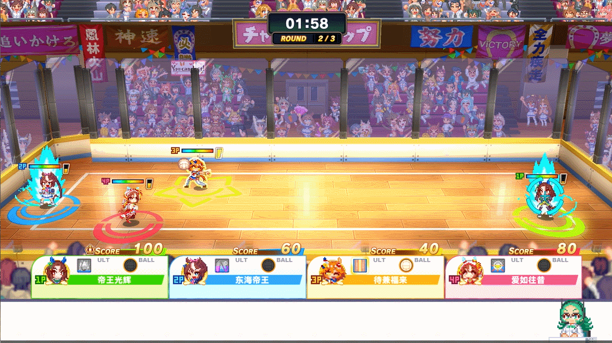 而最能体现《赛马娘 Pretty Derby 热血喧闹大感谢祭!》混乱与乐趣的玩法,大概还要属“躲避球冠军杯”了。这也是现场包括我在内许多媒体同行最喜欢的玩法。躲避球冠军杯的核心玩法就是“丢沙包”——捡起掉落在场地中的球砸向对手,并找准时机接住丢向自己的球获得反攻的机会。