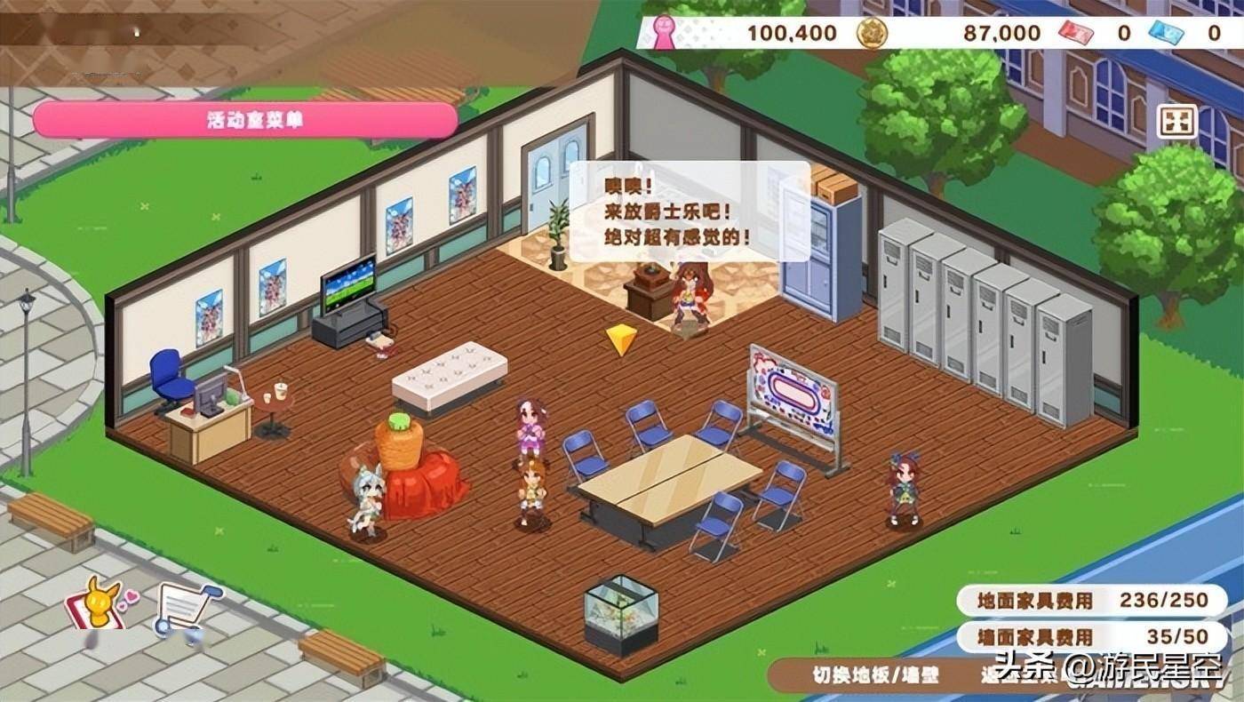 而玩家在单人模式和多人对战中收集到的点数,都可以用来布置属于自己的活动室。你可以兑换各种家具和壁纸,将房间布置成独一无二的样子。之后也可以将自己自己喜爱的马娘摆放在活动室中。根据房间中家具的不同,还会触发马娘们不同的的特殊对话。这个可以由玩家自由装扮的活动室,也是系列粉丝释放自己对马娘喜爱的最佳场所。