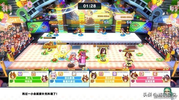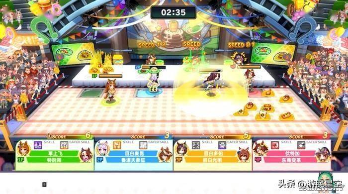 然而,场地中刷新的食物数量和种类是随机的,更何况周围还有三个虎视眈眈的对手。在实际游玩的过程中,我经常遇到满地美食但就是没有我要的颜色,或者几家恰好都在狂炫同颜色食物的情况。这时,场地中偶尔刷新的彩色食物就会瞬间成为争抢的对象。彩色食物可以让马娘无缝改炫其他颜色的食物,也可以提供非常高的分数。马娘们的技能,同样可以在这个过程中提供加成和干扰。