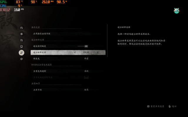 ▲具体的画质设定是先分别采用预设高/超高/影视极预设,然后开启DLSS,且打开帧生成,画面分辨率为2560×1600。注意,游戏中的DLSS档位为“超采样清晰度”,也就是缩放比例,最低是25%,最高是100%,拉到62%及以上是“质量”,在55%~到61%之间是“均衡”,再往下则是“性能”和“极致性能”。牛叔测试的缩放比例是62%,即刚好到DLSS 3质量挡位。