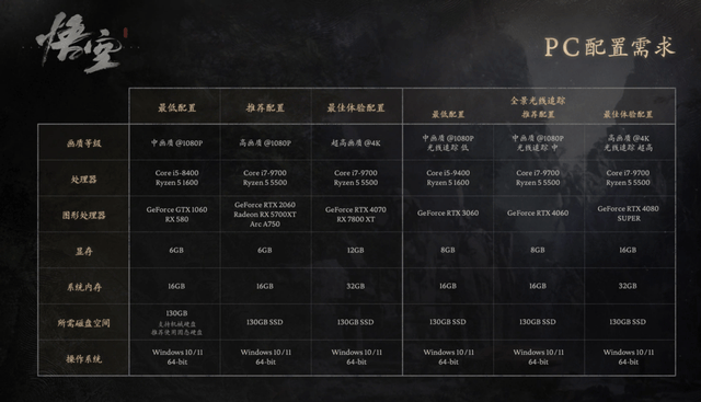 先看看游戏的大致情况,《黑神话:悟空》是一款以中国神话为背景的动作角色扮演游戏,而这款游戏之所以拥有如此高的热度,除了大家再熟悉不过的《西游记》游戏背景,孙悟空、四大天王、黑熊精、黄眉老怪等经典人物形象之外,优秀的美工设计和画面也是让玩家们热血沸腾的关键之一。《黑神话:悟空》采用了目前最新的虚幻5引擎打造,支持NVIDIA最新的全景光线追踪以及DLSS 3.5技术,另外还加入了精细的建模以及动态全局光照技术,能够呈现极为精美的动态光影效果。所以可想而知,这款游戏在特效全开的情况下,对于电脑硬件的要求并不会低。