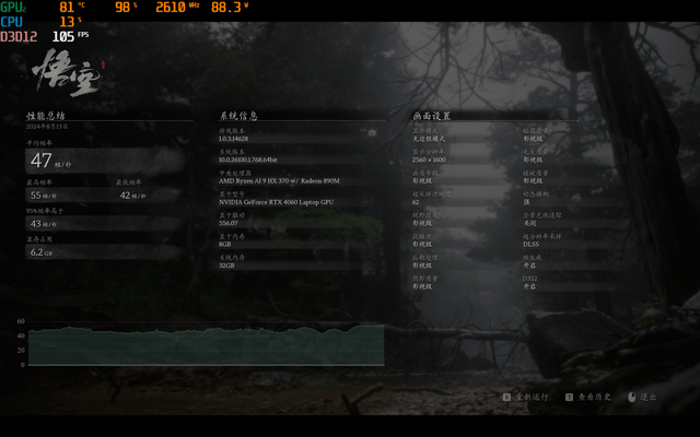 ▲OK,开始进入性能测试,首先是2.5K影视级画质+DLSS 3质量,RTX 4060轻薄本的测试成绩是47fps——这个成绩算是开了一个好头,毕竟已经2.5K最高画质了,也许谈不上特别流畅,但配合DLSS 3能达到47fps也算是能玩的水平(顺便说一句,如果是常规的RTX 4060游戏本,那么帧速会高稍微一些)。另外,如果不开启DLSS 3,将超采样清晰度设置成100%,那么帧速就只有19fps,显然,《黑神话:悟空》的硬件要求并不低。