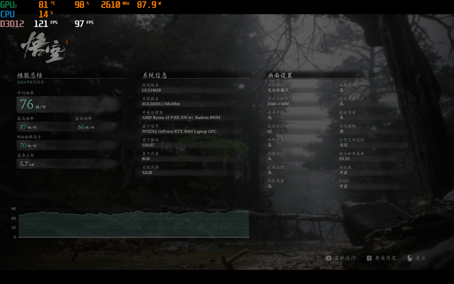▲到了2.5K高画质+DLSS 3质量,平均帧速暴涨到了76fps。还记得之前牛叔在《黑神话:悟空》将至,什么样的笔记本能流畅玩?谈到RTX 4060搞定2.5K高画质压力不大,这下就得到了证实。RTX 4060轻薄本都能以2.5K高画质+DLSS 3质量流畅运行,那么RTX 4060游戏本是妥妥的没问题了。所以这也就回答了本文的问题:对于当前甜品级的RTX 4060游戏本而言,的确能在2.5K分辨率下流畅运行《黑神话:悟空》。当然有个前提,你得开启DLSS 3。此外,等到游戏证实发售以后,大家也可以根据自己对画面的要求,自行调整“超采样清晰度”。