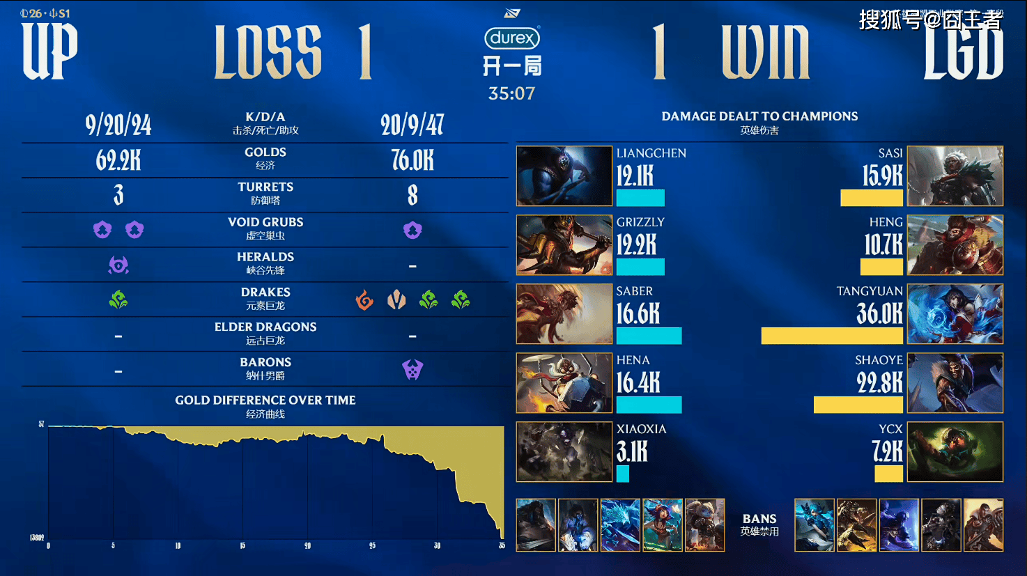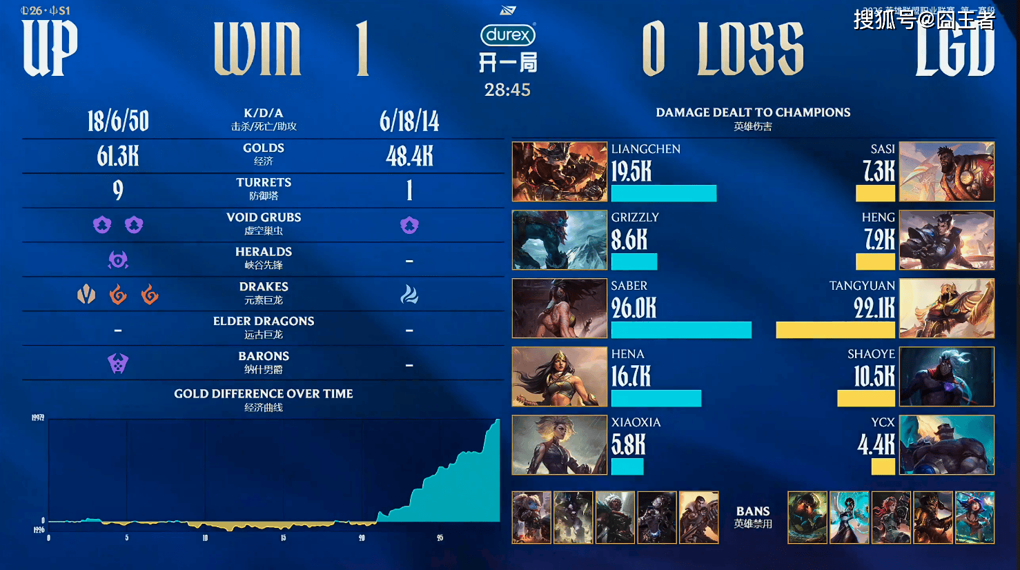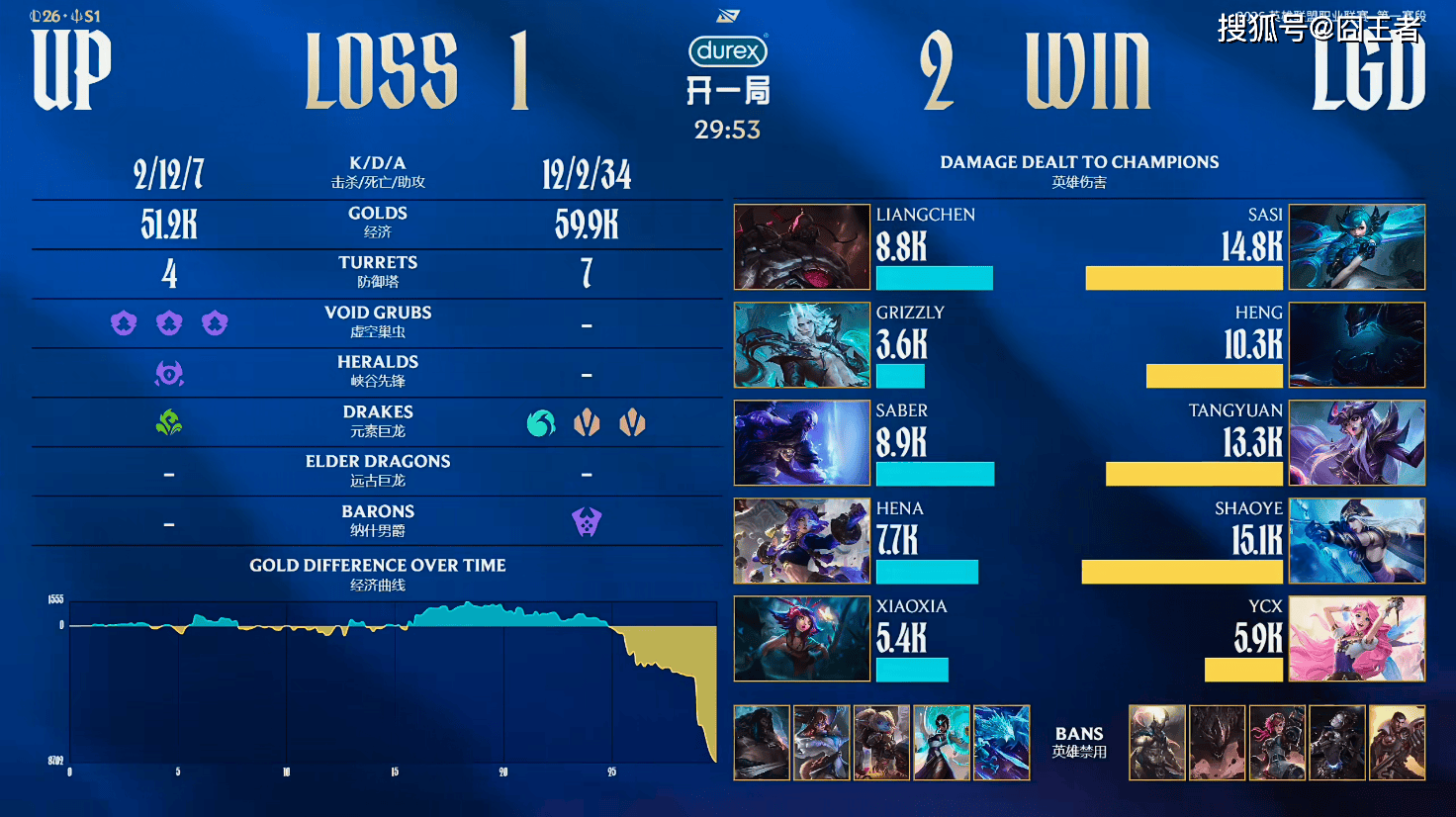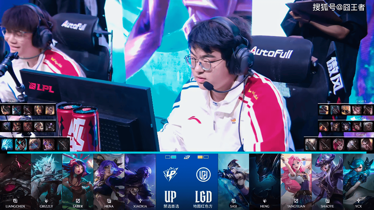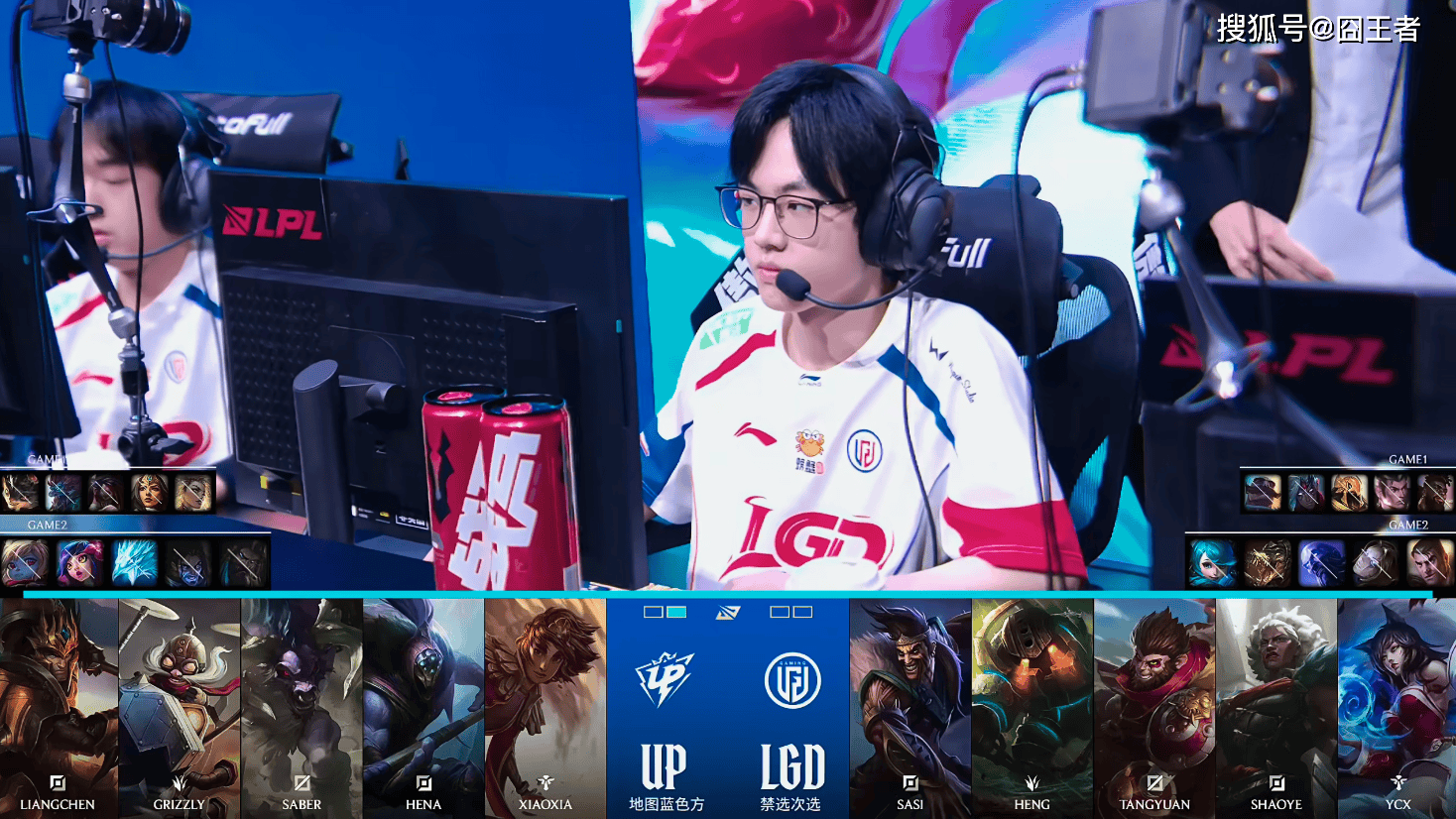 第一局比赛,UP蓝色方,禁用:杰斯,发条,狼母,牛头,波比,选用:Liangchen兰博,Grizzly巨魔,Saber阿卡丽,Hena希维尔,Xiaoxia芮尔;LGD红色方,禁用:妮蔻,皇子,蔚,卡尔玛,泰坦,选用:sasi奎桑提,Heng赵信,Tangyuan沙皇,Shaoye韦鲁斯,Ycx布隆
