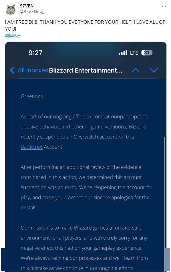 事情发生后广大网友自然是站在S7VEN这一边的,纷纷对其声援。好在暴雪也最终回应了S7VEN,撤回了对其账号的封禁,避免他失去争取奖学金的资格。
