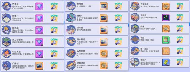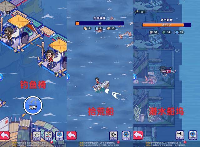 在游戏初期,玩家需要拾取海面上漂浮的垃圾,以此作为起始资源。在完成基础物资储备后,各类资源收集建筑将逐步解锁(如钓鱼椅、拾荒船、潜水船坞)。这些建筑在初始阶段需手动操作,升级后则可解锁自动挂机功能,从而实现各类初级材料的稳定获取。