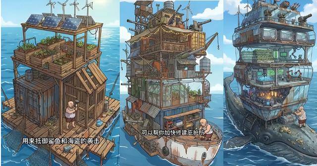 而在视频后,画面转向通过建造逐步掌控命运的成就感。画面中的小人从零开始建设巨轮,从海上木筏,到简易木屋,再到浮岛基地,巨型堡垒等,每阶段改造都有显著视觉跃升和功能解锁。而在视频最后,画面中的小人实现“从求生到统治海洋”的身份逆转。每一次巨大的变化都在短时间内完成,为观众带来极具冲击力的情绪反馈。