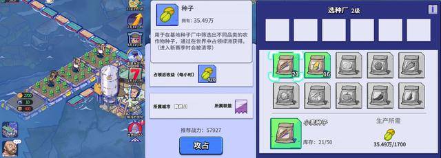 同时,大世界玩法开启后,玩家将解锁农田,种下种子便能收获对应的农作物,这些农作物还可送至海产厨房等建筑进行加工。各类农作物种子需通过特定途径获取,玩家可在大地图中攻占绿洲资源点,以此获得稳定的种子产出;绿洲资源点升级后,还能提升占领状态下每小时的种子收益。玩家获取的种子,也可用于完成模拟经营板块的后续任务。