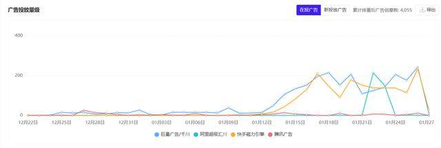 根据AppGrowing显示,《疯狂水世界》广告总数为4055。从1月12日开始,游戏的广告投放量级逐渐上升。其中,巨量广告/千川广告投放创意数为2335,创意数量最多。其次是快手磁力引擎,广告投放创意数为1242。