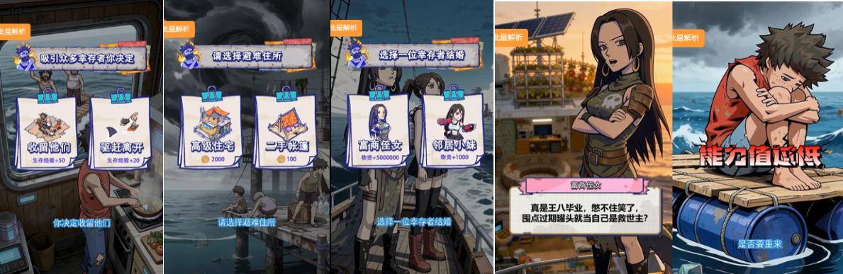 除了上下分屏对比的素材,选择型驱动的视频也比较多。它用简洁醒目的UI弹窗,把观众拉入末日里的关键抉择时刻。在资源匮乏的绝境中,是选择收留幸存者换取生存经验,还是为了自保将他们驱赶;搭建避难所时,是倾尽所有换一处高级住宅,还是用简陋的二手帐篷勉强度日;是和携带巨额物资的富商侄女结婚,还是选择邻家小妹相伴。这类素材还会设计极具戏剧性的反转结局,让广告形成深刻的记忆点。