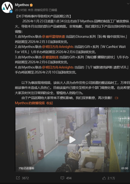 如此“国货之光”,却发生了人祸。就在27日,Myethos发了一条微博表示一些手办要延期了,原因并非产能赶不上手办质量不达标,而是“人为纵火”。